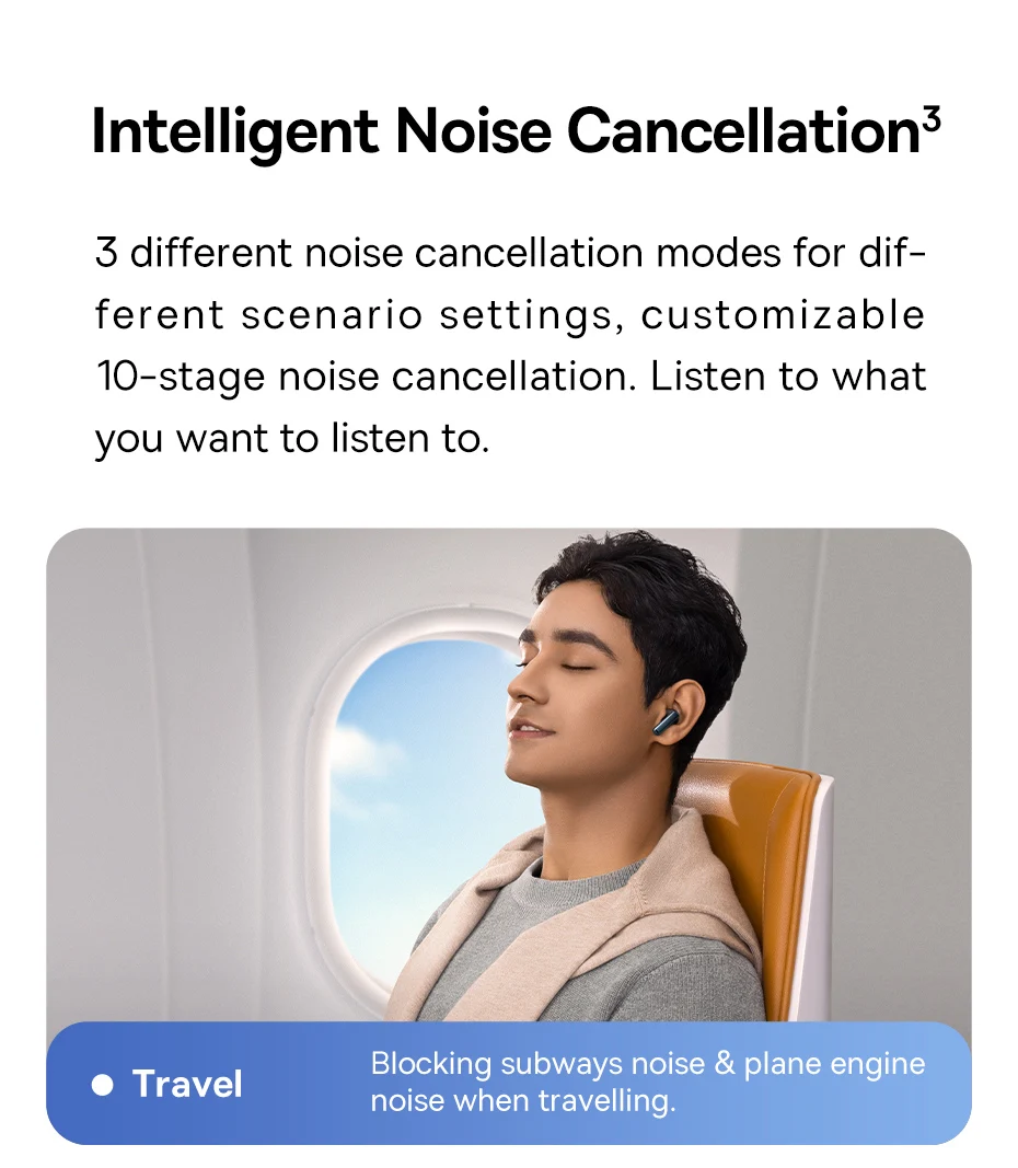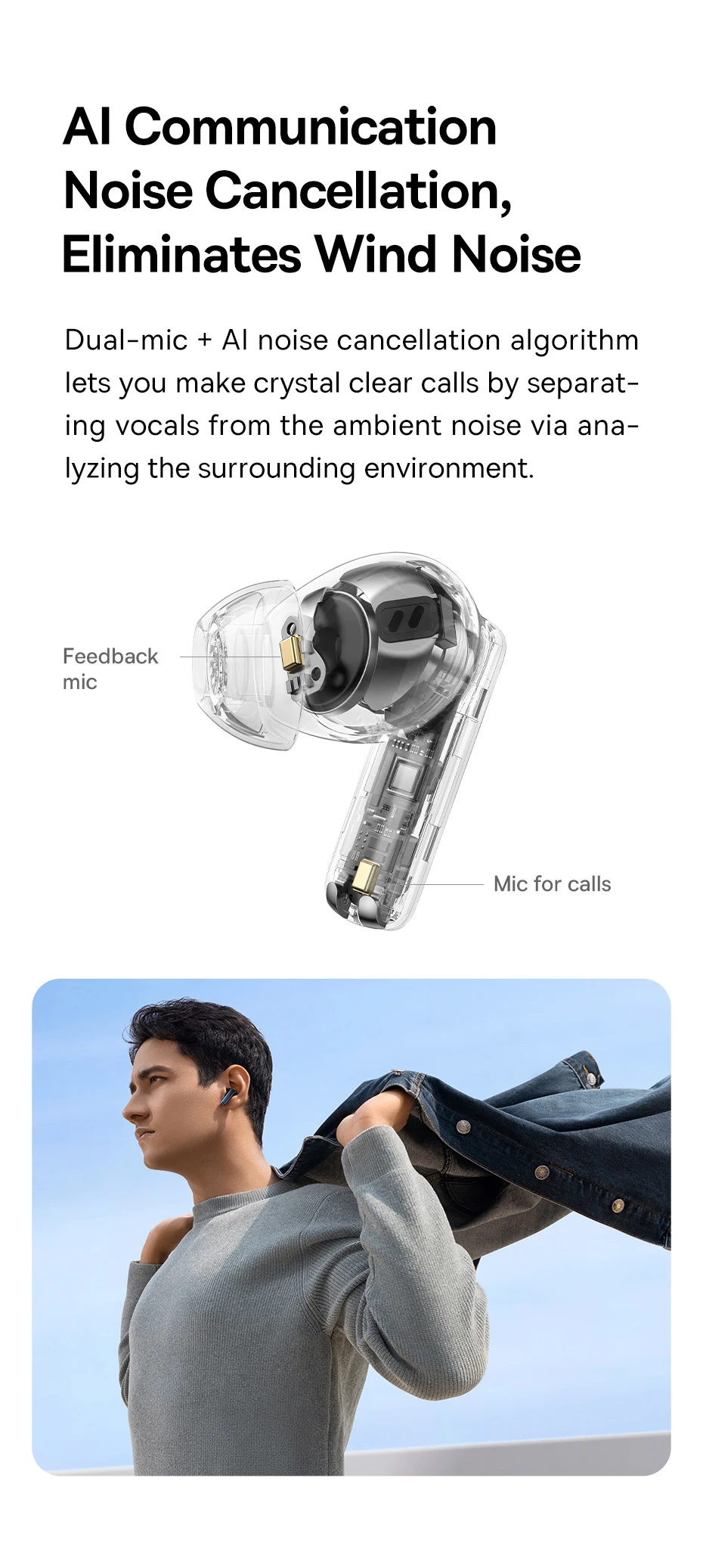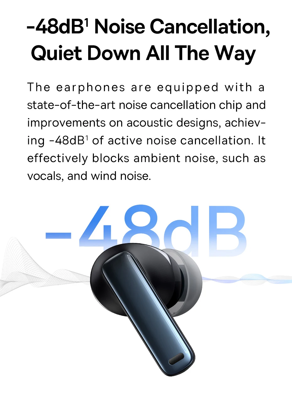 Logrando-48dB de cancelación activa de ruido. Bloquea eficazmente el ruido ambiental, como las voces y el ruido del viento.