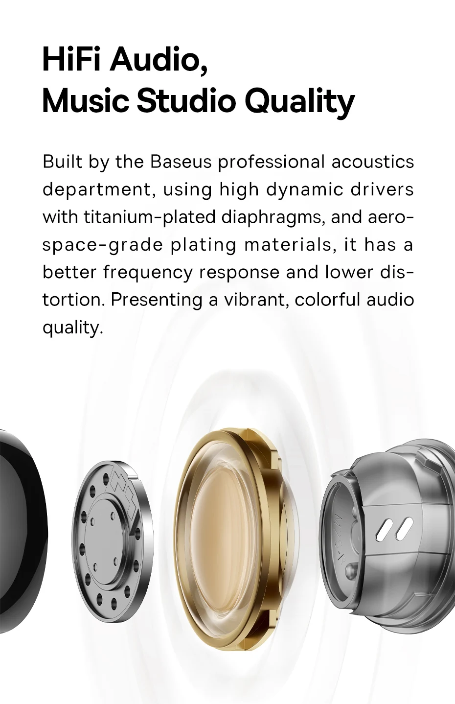 Construido por el Departamento de acústica profesional de Baseus, que utiliza controladores de alta dinámica con diafragmas chapados en titanio,