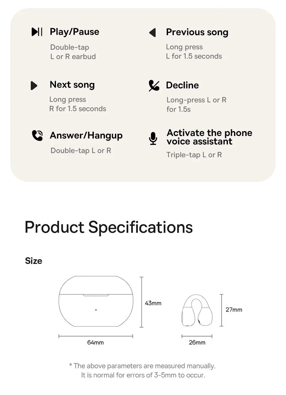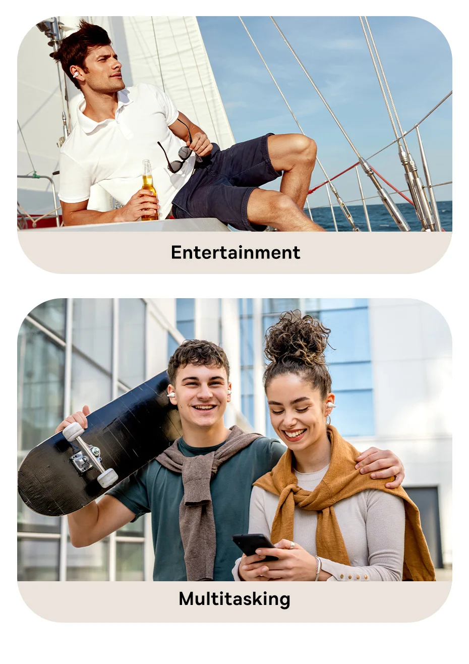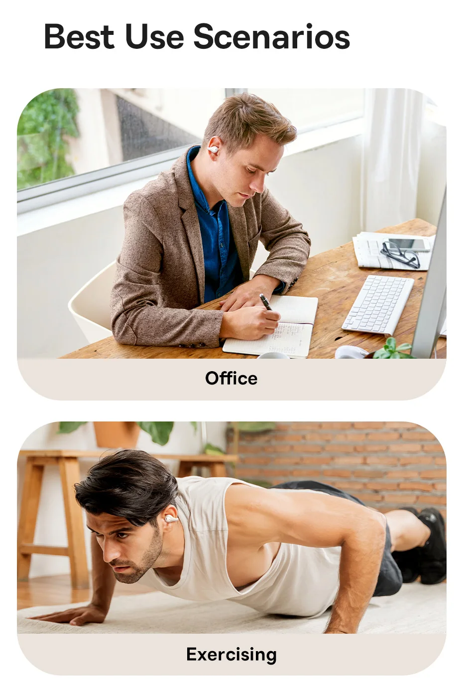 No me lastima los oídos y puedo escuchar bien los sonidos. También puedo escuchar los sonidos externos claramente, así que no hay incomodidad. Cuando subo el volumen, suena como si estuviera escuchando a través de altavoces y también se puede escuchar desde el lado. La desventaja es que no puedo escuchar a un volumen alto. Pero con la conexión de la aplicación, los graves se mejoran, por lo que vale la pena escuchar canciones.