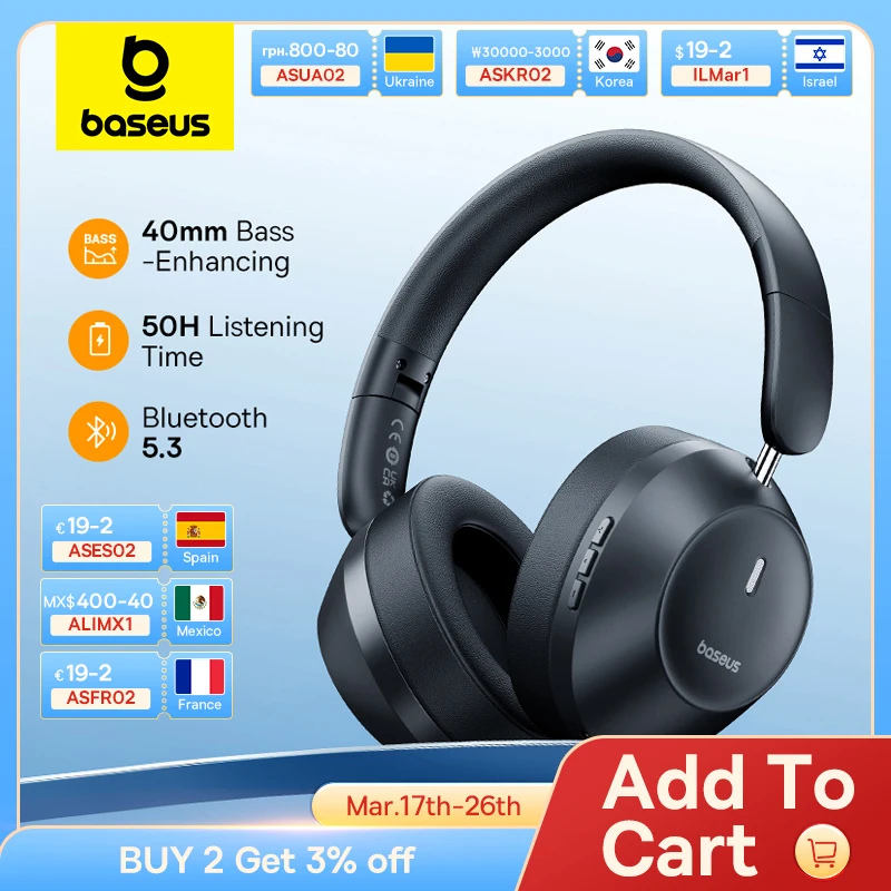 Comprar Baseus Bass 30 Max auriculares inalámbricos Bluetooth 5,3 40mm diafragma de mejora de graves 50H sobre auriculares auriculares de latencia ultrabaja