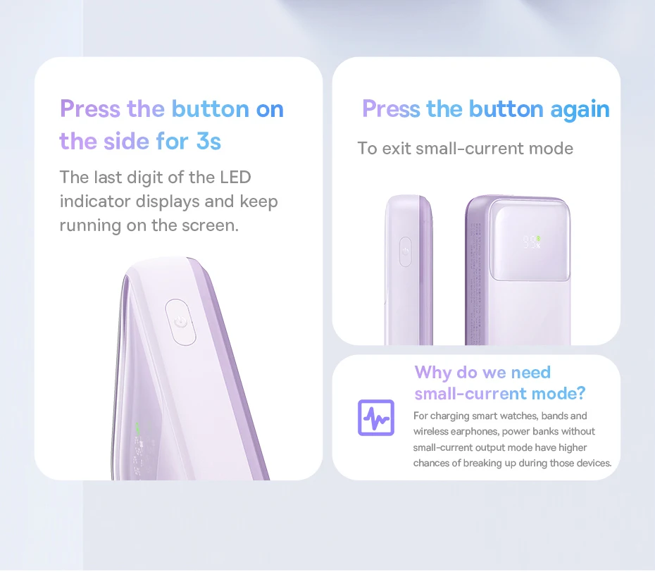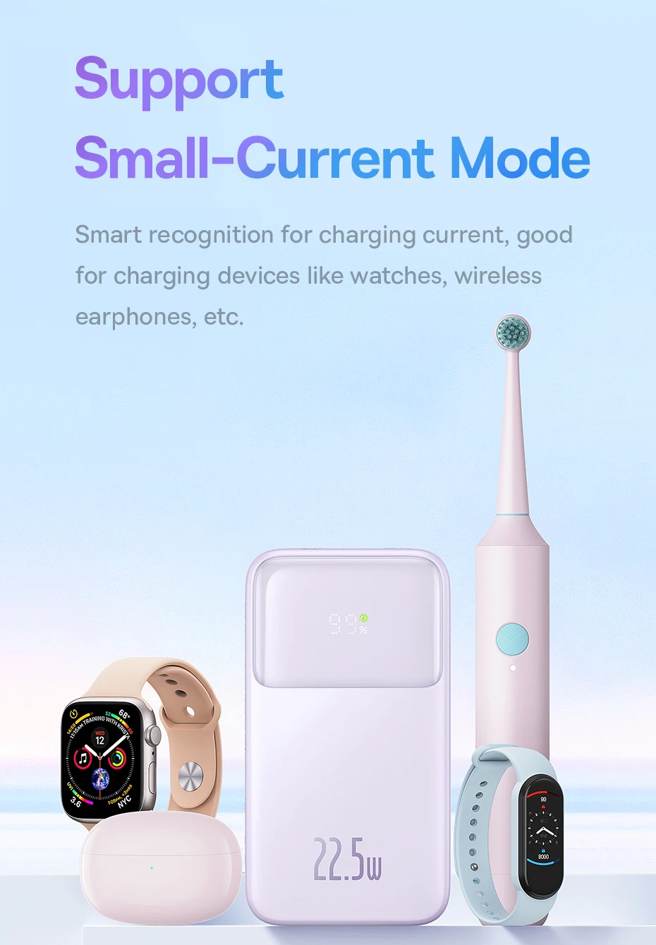 Para cargar relojes inteligentes, bandas y auriculares inalámbricos, los bancos de energía sin Modo de Salida de corriente pequeña tienen mayores posibilidades de romperse durante esos dispositivos.