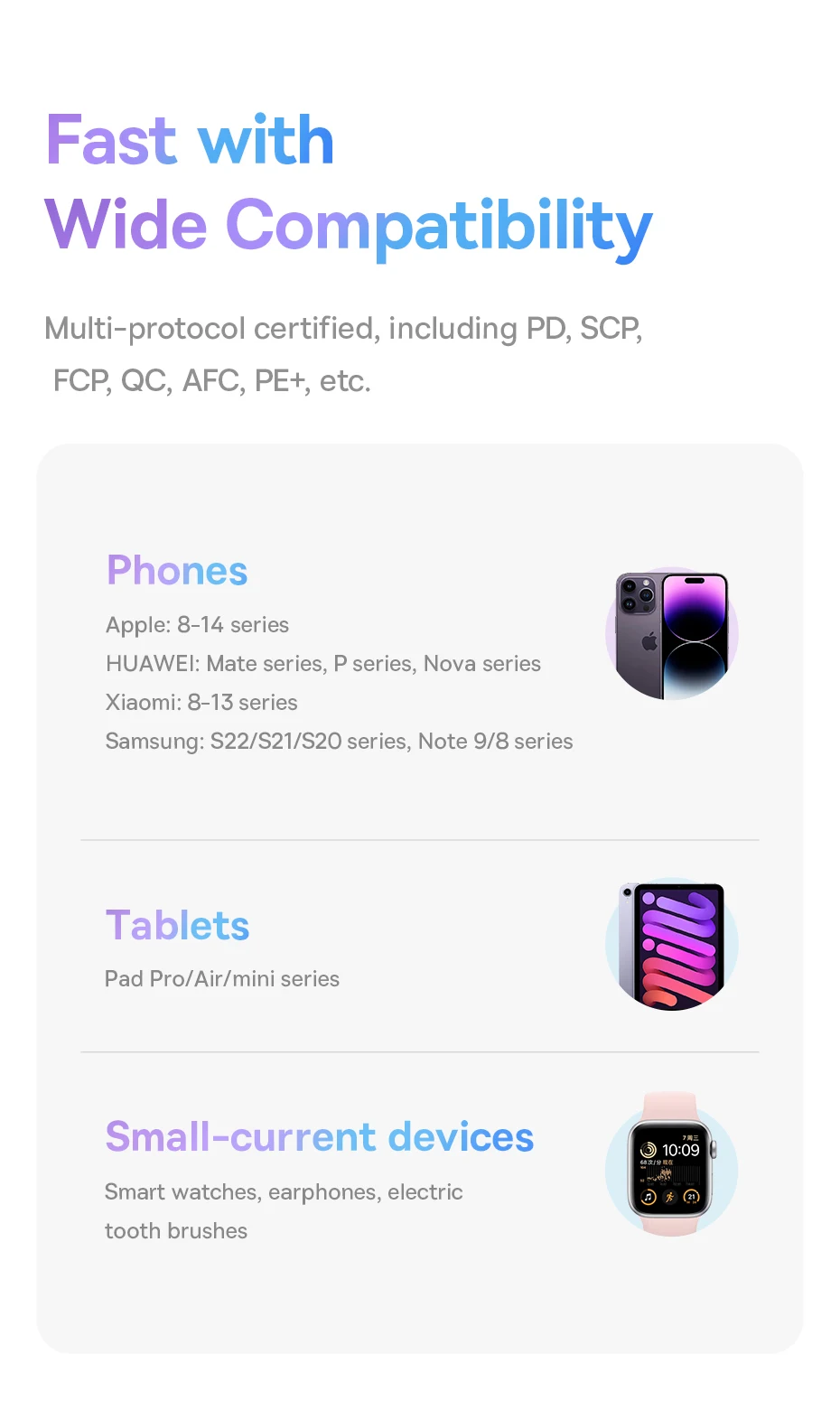 Certificado multiprotocolo, incluyendo PD,SCP,FCP, QC,AFC, PE +, etc.