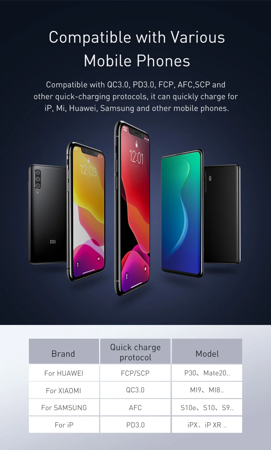 Compatible con QC3.0, PD3.0, FCP, AFC,SCP y otros protocolos de carga rápida, puede cargar rápidamente iP, Mi, Huawei, Samsung y otros teléfonos móviles.