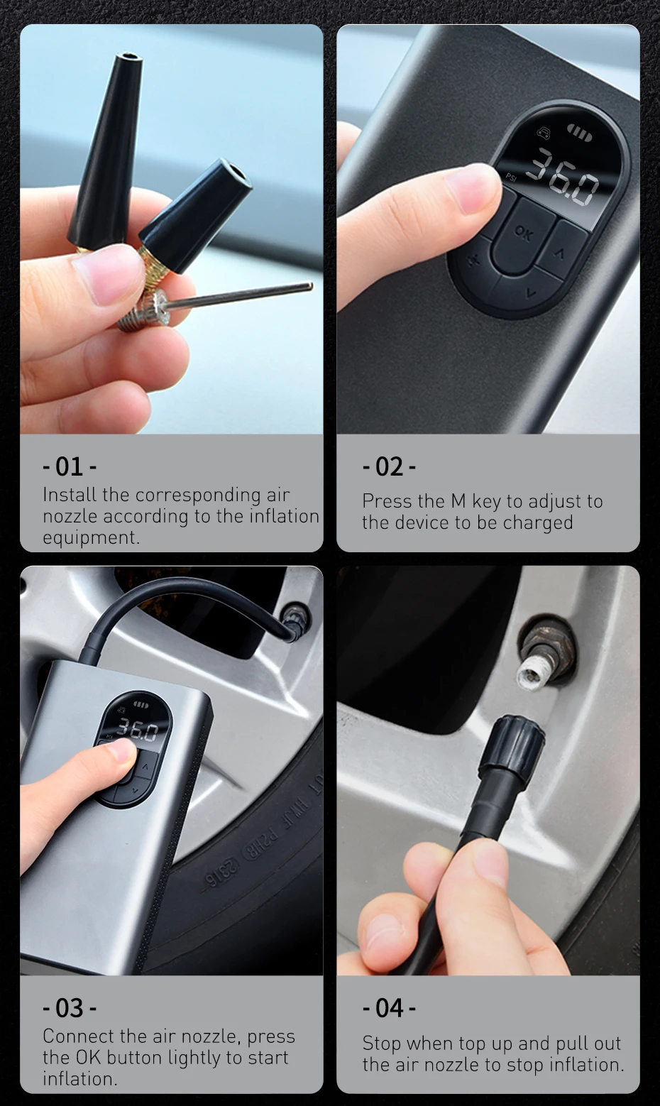 Pantalla automática del estado de la presión de los neumáticosUn chip de sensor inteligente está integrado en la boquilla de aire. La presión de los neumáticos se detecta automáticamente y se muestra una vez se conecta.