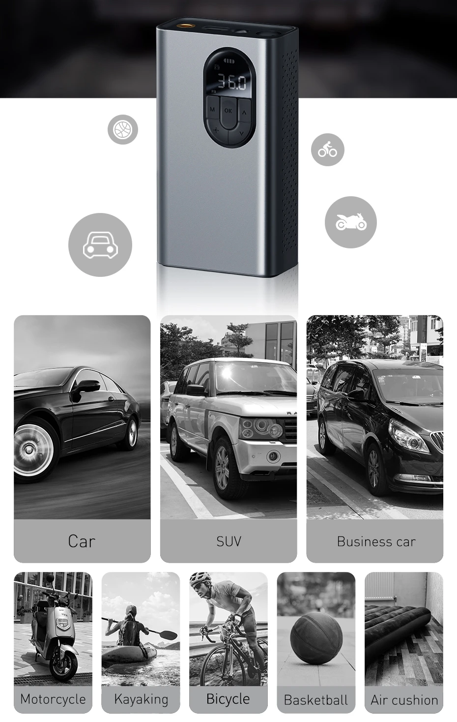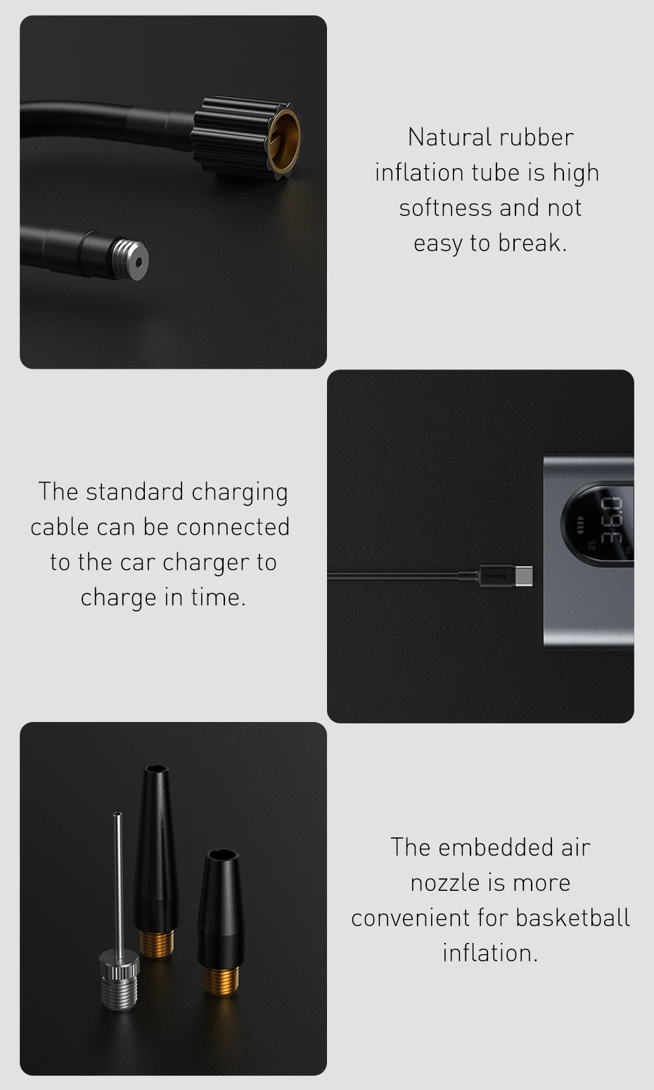 Nombre: bomba infladora de fuente de energía BaseusPeso: 610gVoltaje de entrada: 5V/ACapacidad de la batería: 6000mahEnergía nominal: 25. 9WhPotencia: 54WTiempo de carga: alrededor de 4-5hRango del manómetro:5-PSI rango de funcionamiento efectivo:Rango de detección efectivo 5-150psl;Más de 150psi puede dañar el sensor.