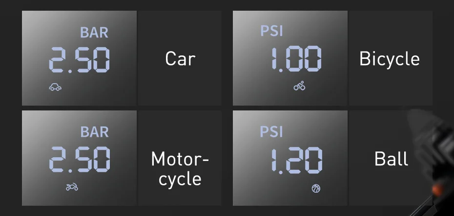 El chip integrado de alta precisión mide e indica la presión actual del neumático en la pantalla LED.