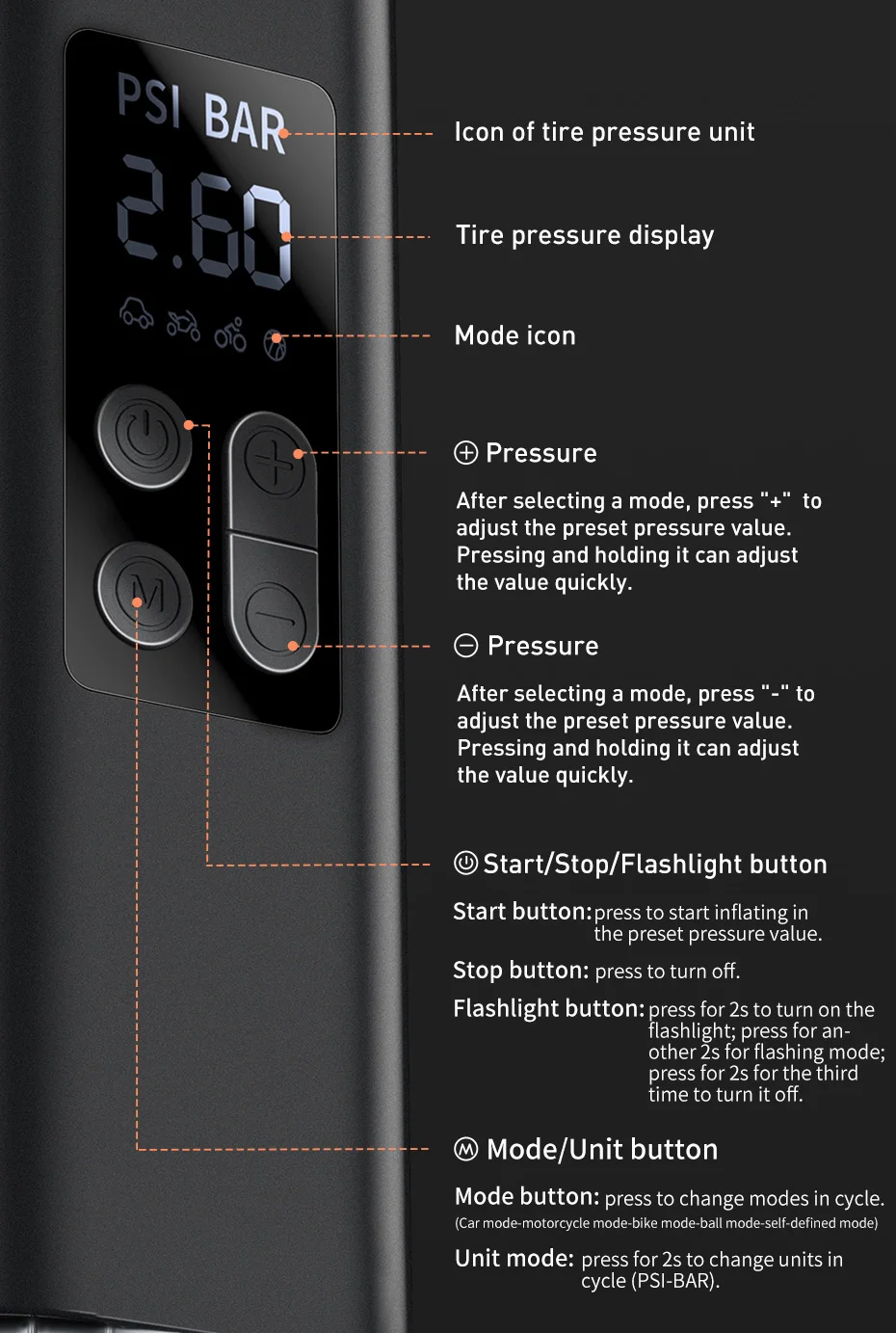 Mantenga presionado para encender la linterna LED para inflar en la oscuridad o para uso de emergencia.