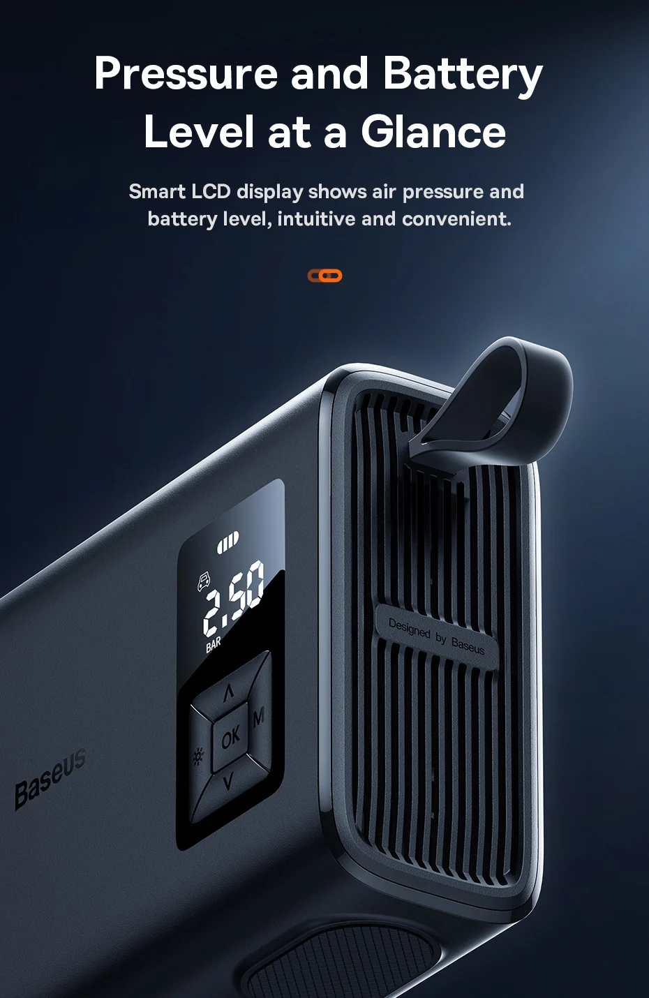 La pantalla LCD inteligente muestra la presión del aire y el nivel de la batería, de manera intuitiva y conveniente.