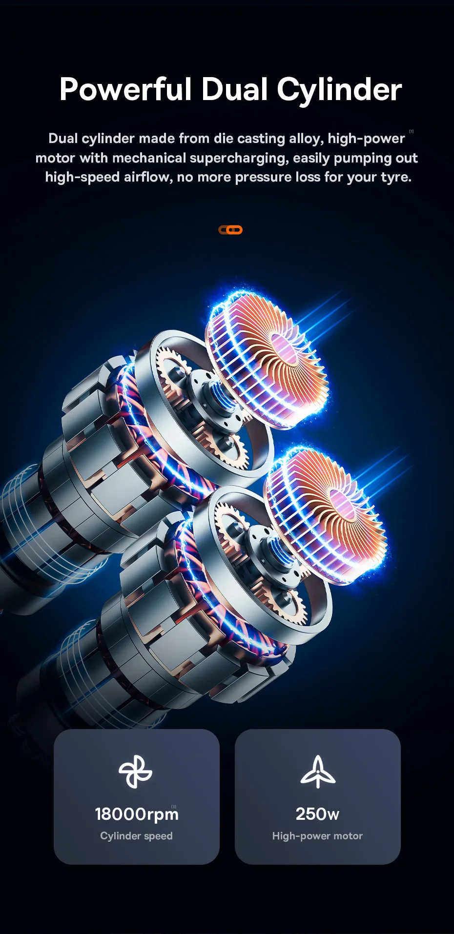 Cilindro doble hecho de aleación de fundición a presión, motor de alta potencia con sobrealimentación mecánica, bombeando fácilmente el flujo de aire a alta velocidad, no más pérdida de presión para su neumático.