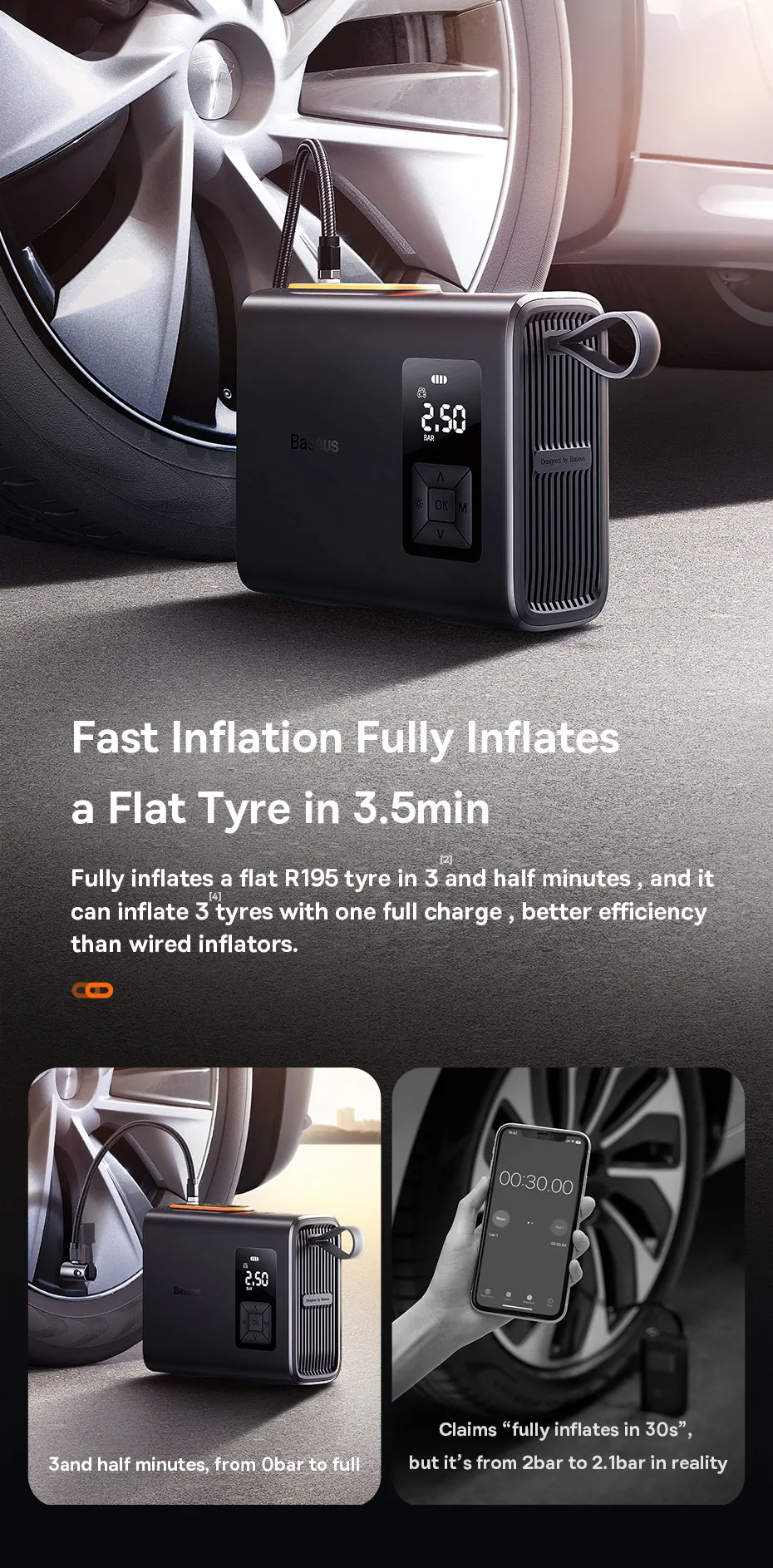 √ Rápido: 3 veces más rápido, infla completamente un neumático R195 plano en 3 minutos y medio.