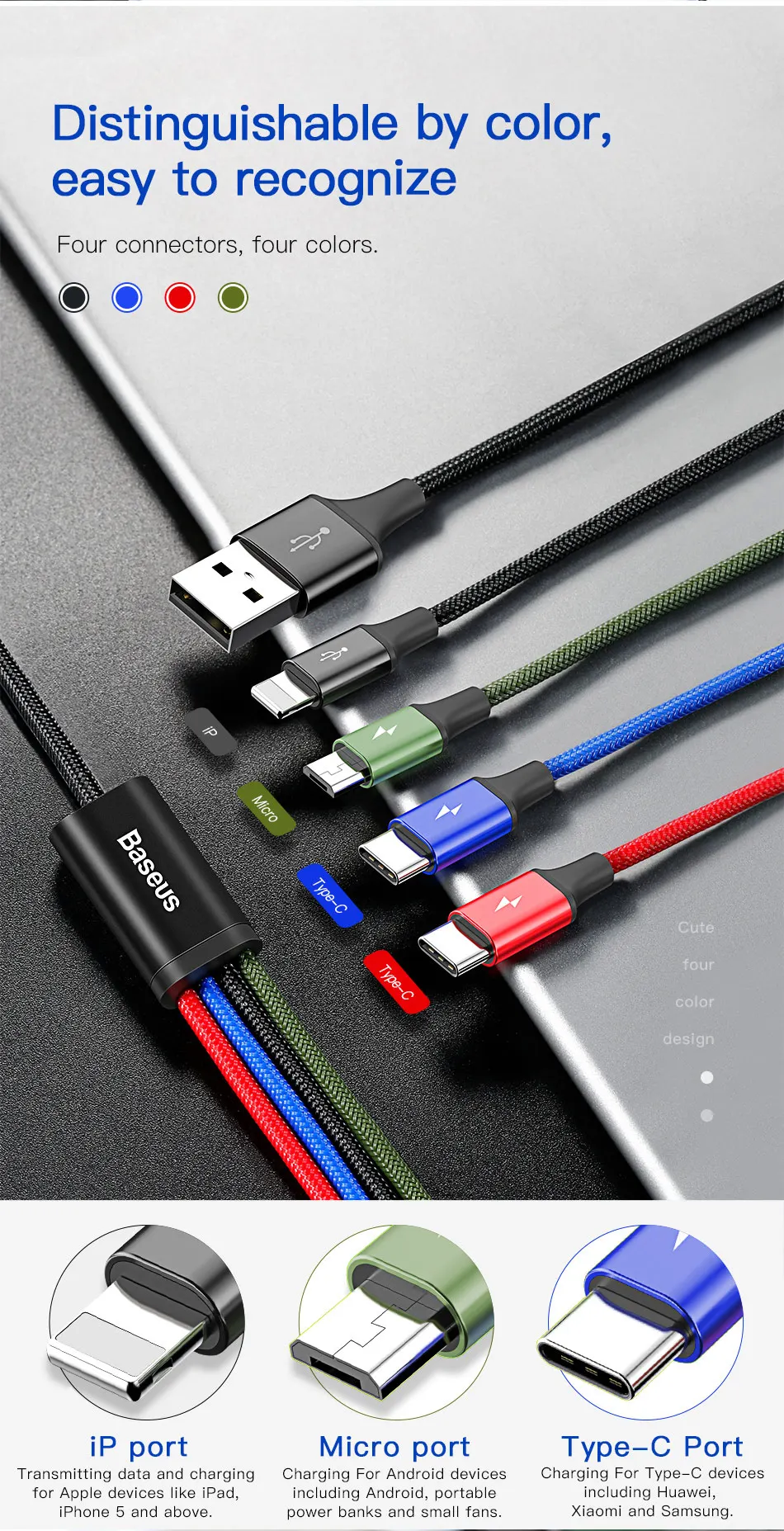 Comprar Baseus-Cable USB 3 en 1 para móvil, accesorios del teléfono móvil, Cable Micro USB 4 en 1 para iPhone 11, 8, Xr, Samsung S20, Redmi Note 9s