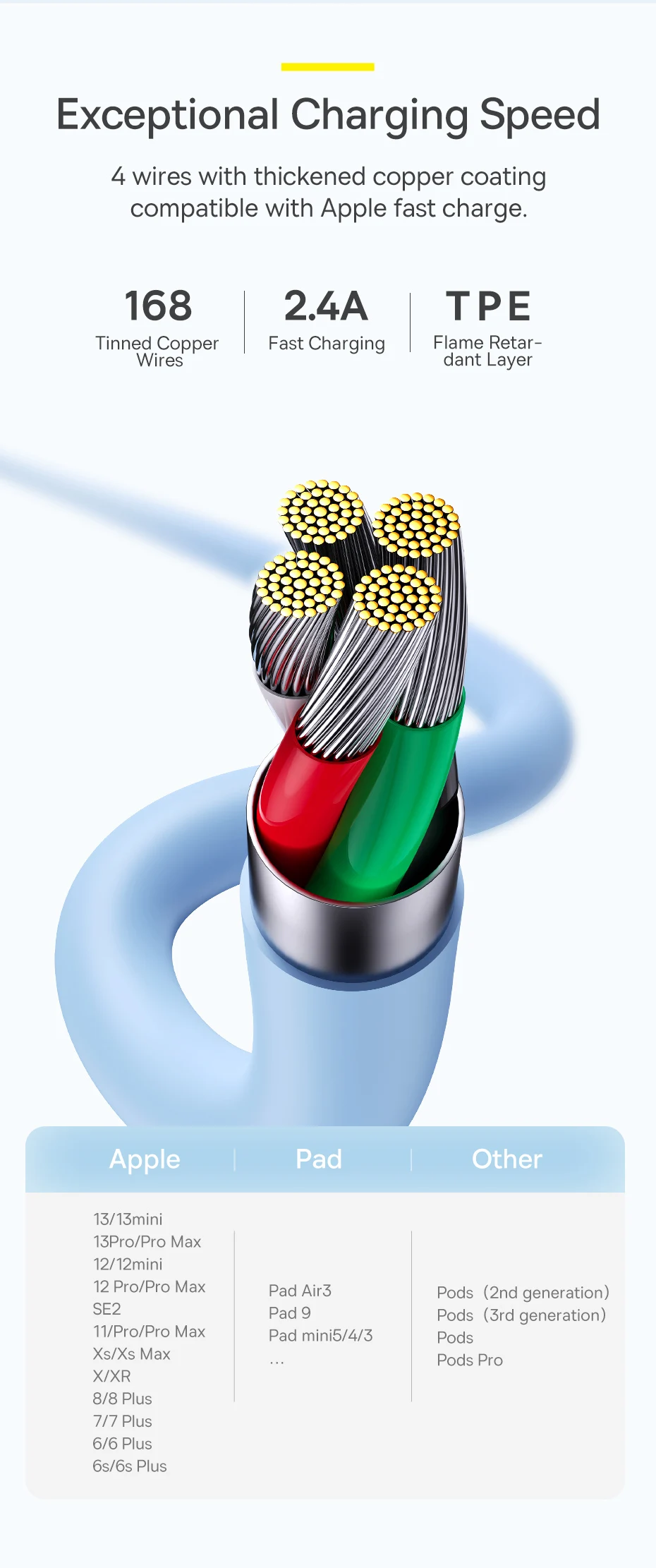 4 cables con revestimiento de cobre engrosado compatible con carga rápida Apple.
