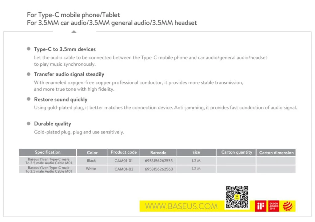 Comprar Baseus-Cable USB tipo C para auriculares, conector de Audio macho a Jack de 3,5mm, para altavoz, para Xiaomi, Huawei y Samsung