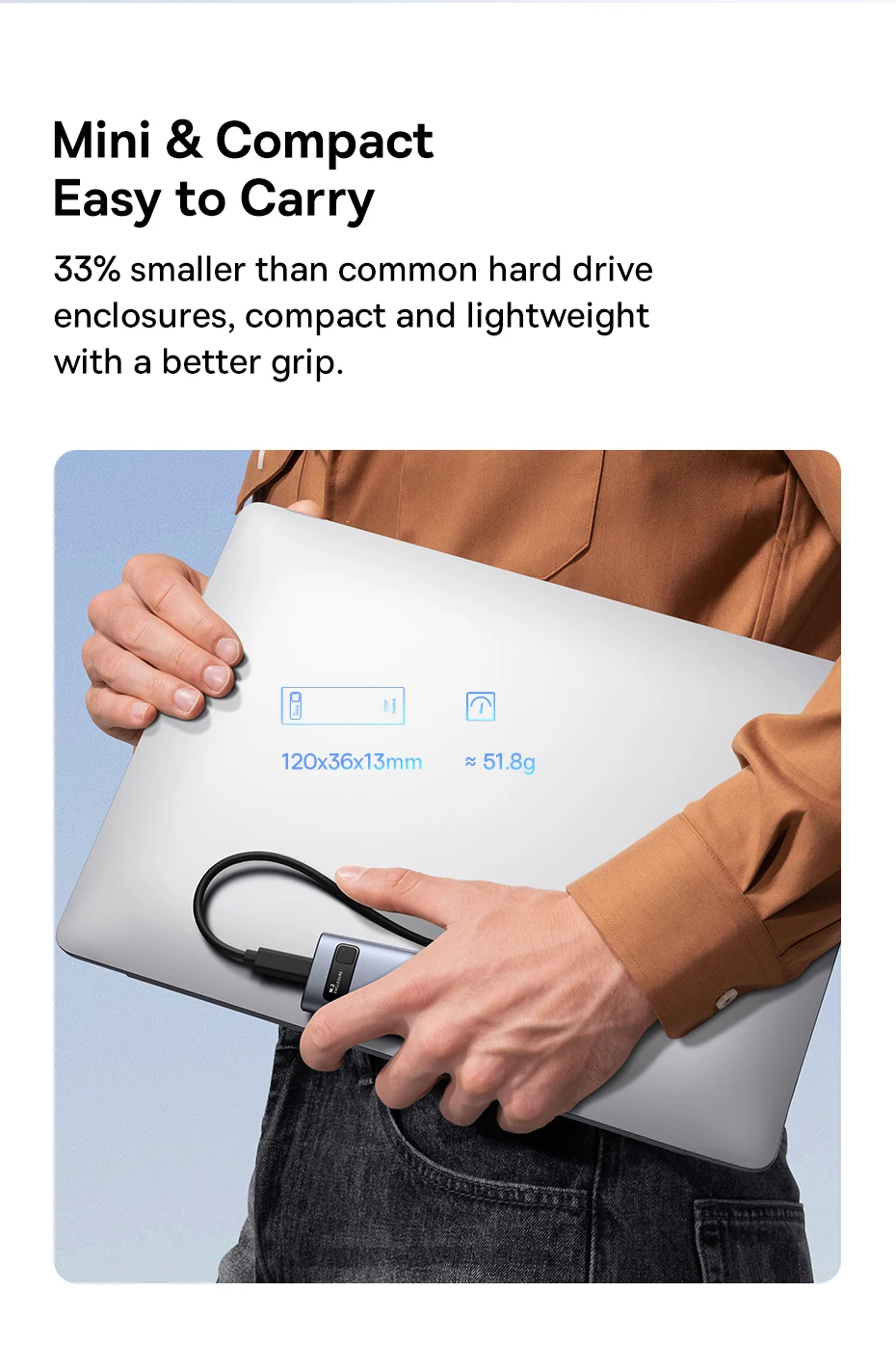 33% más pequeñas que las carcasas de disco duro comunes, compactas y ligeras con un mejor agarre.