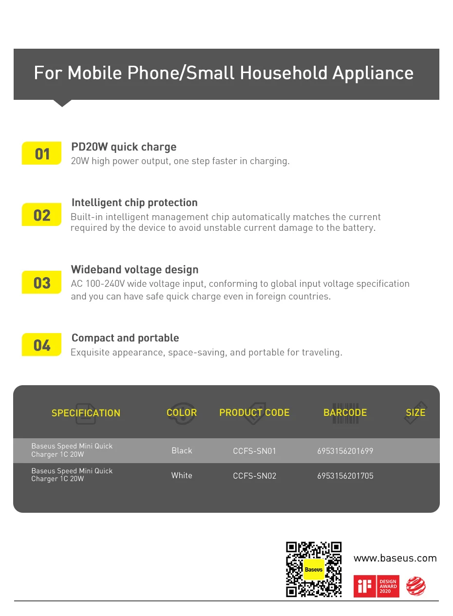 Nombre: Mini cargador rápido Baseus Speed 1C 20W EU