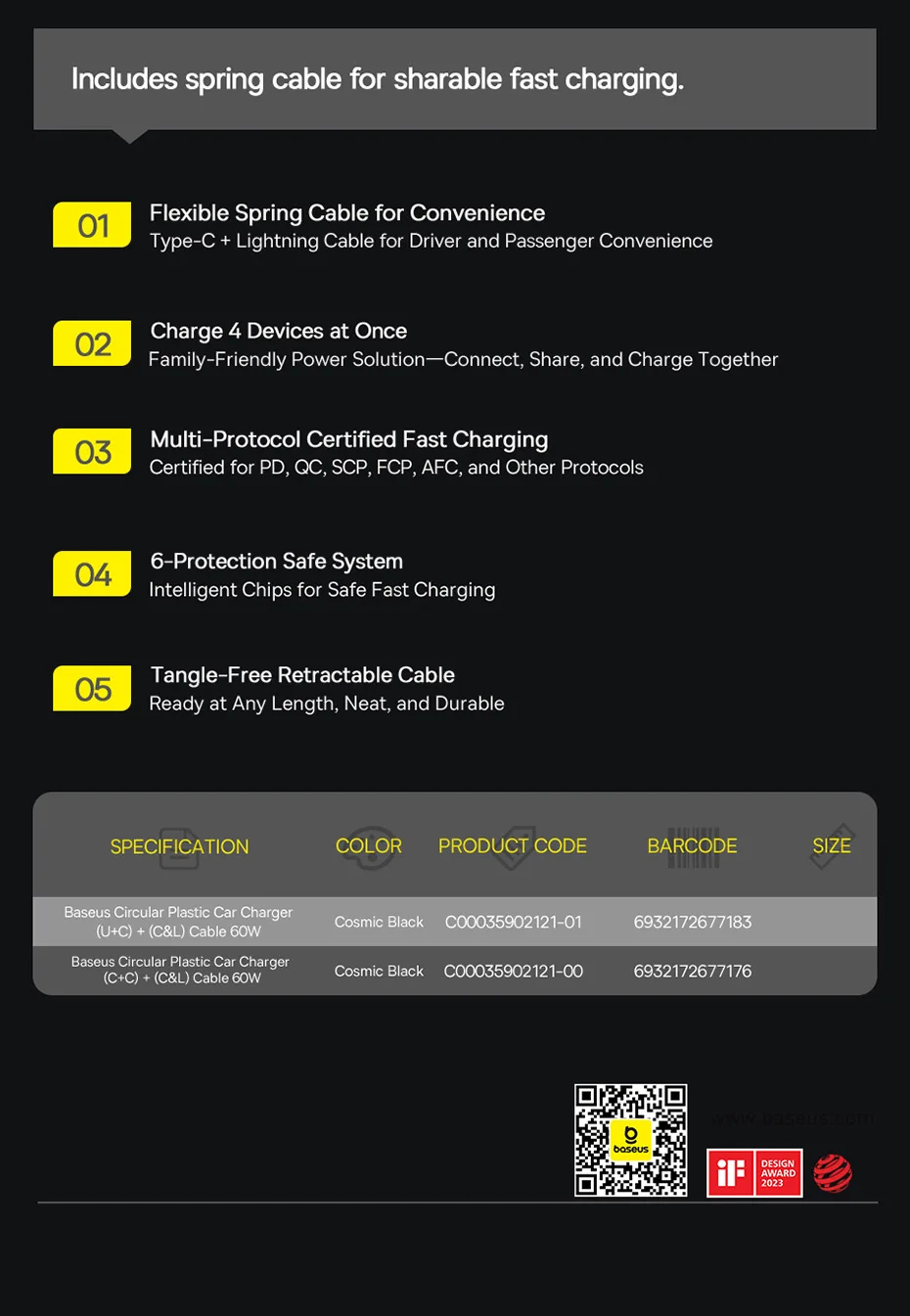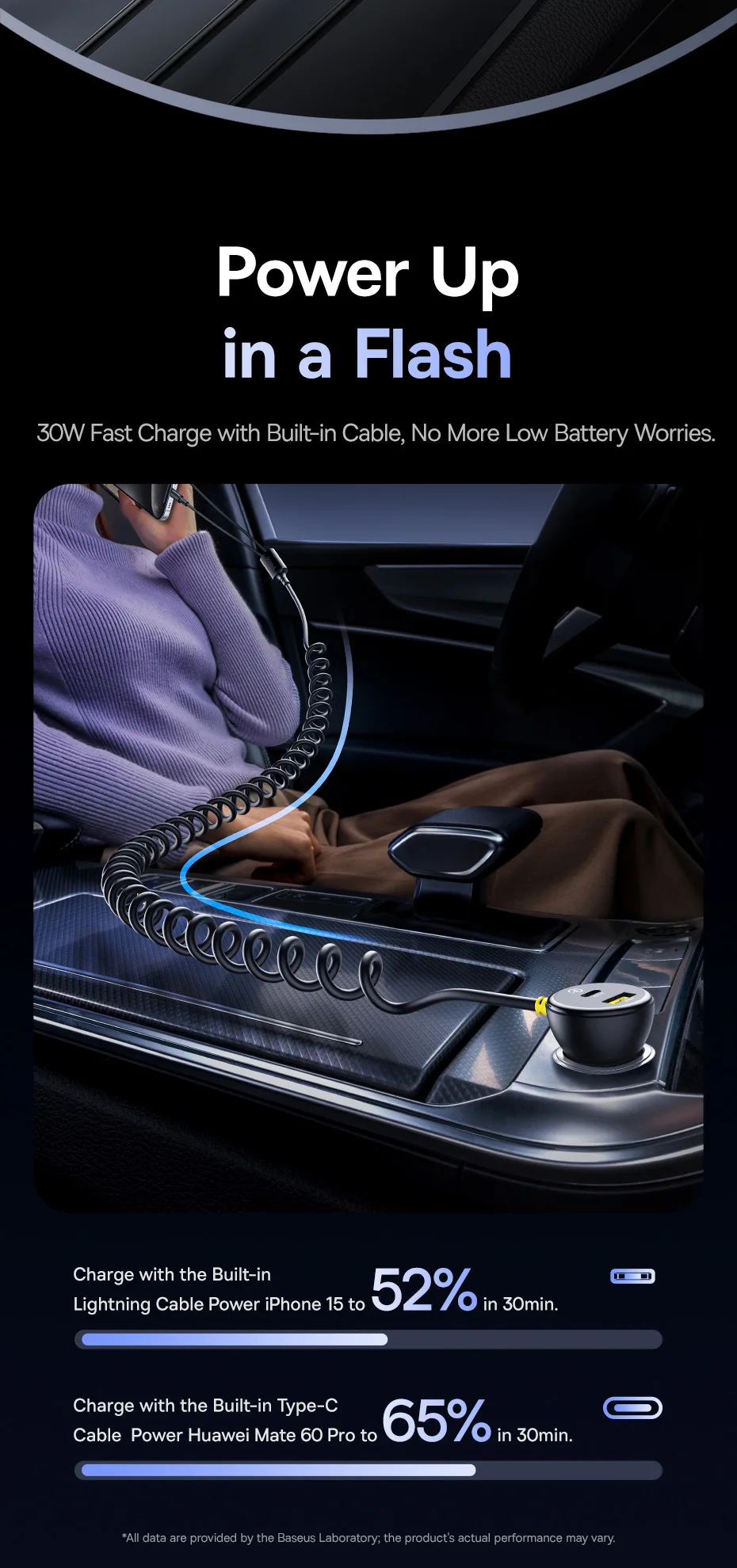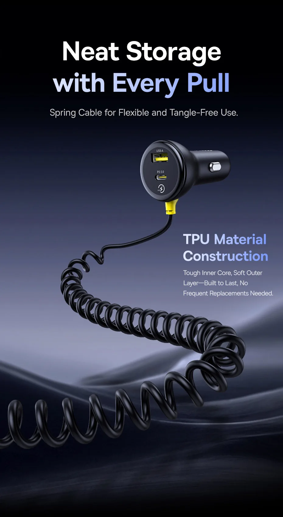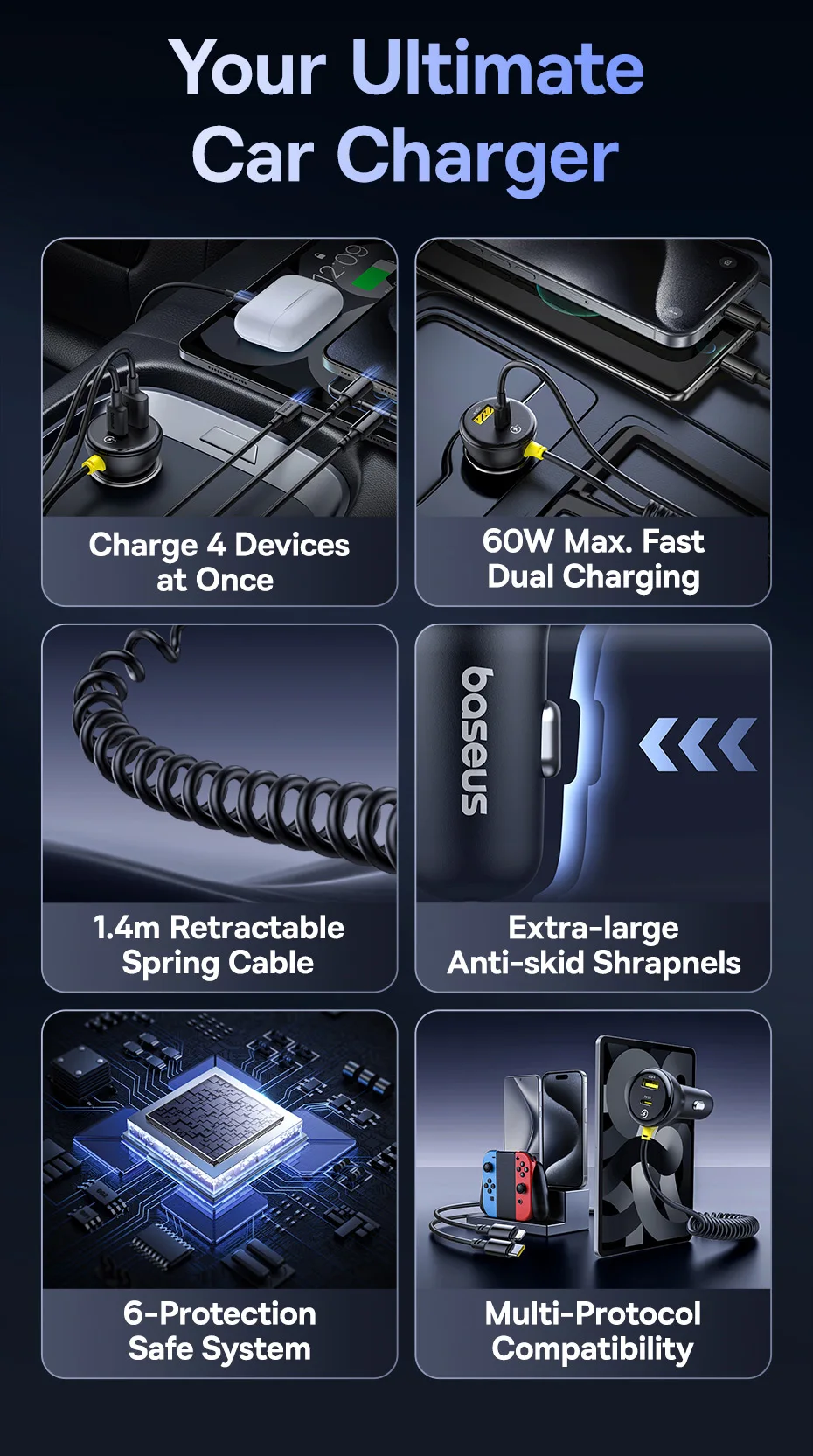 Baseus-cargador de coche de 60W, Cable de resorte retráctil PD QC SCP FCP AFC, carga rápida para iPhone, Samsung, Xiaomi, cargador de teléfono para coche