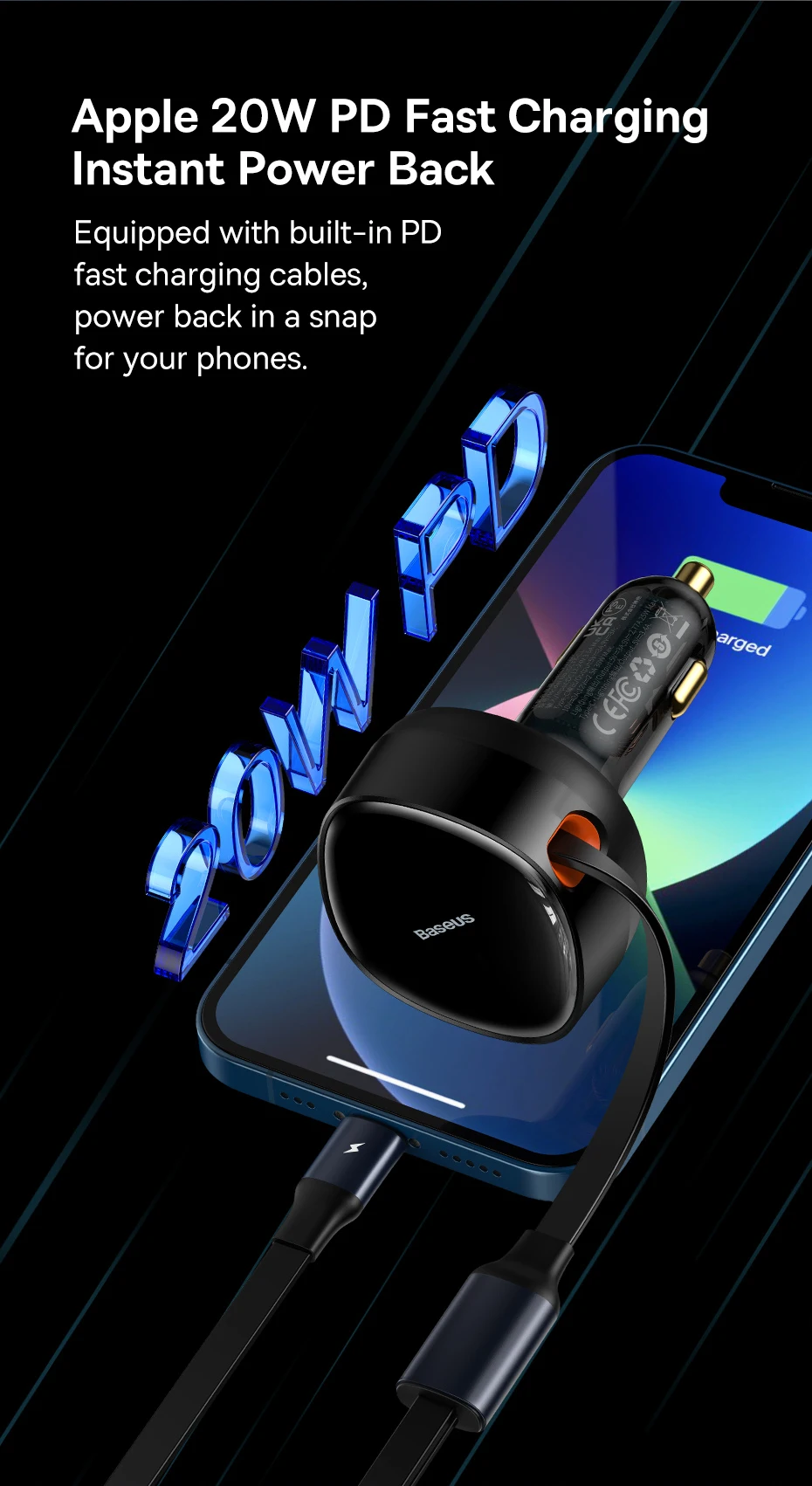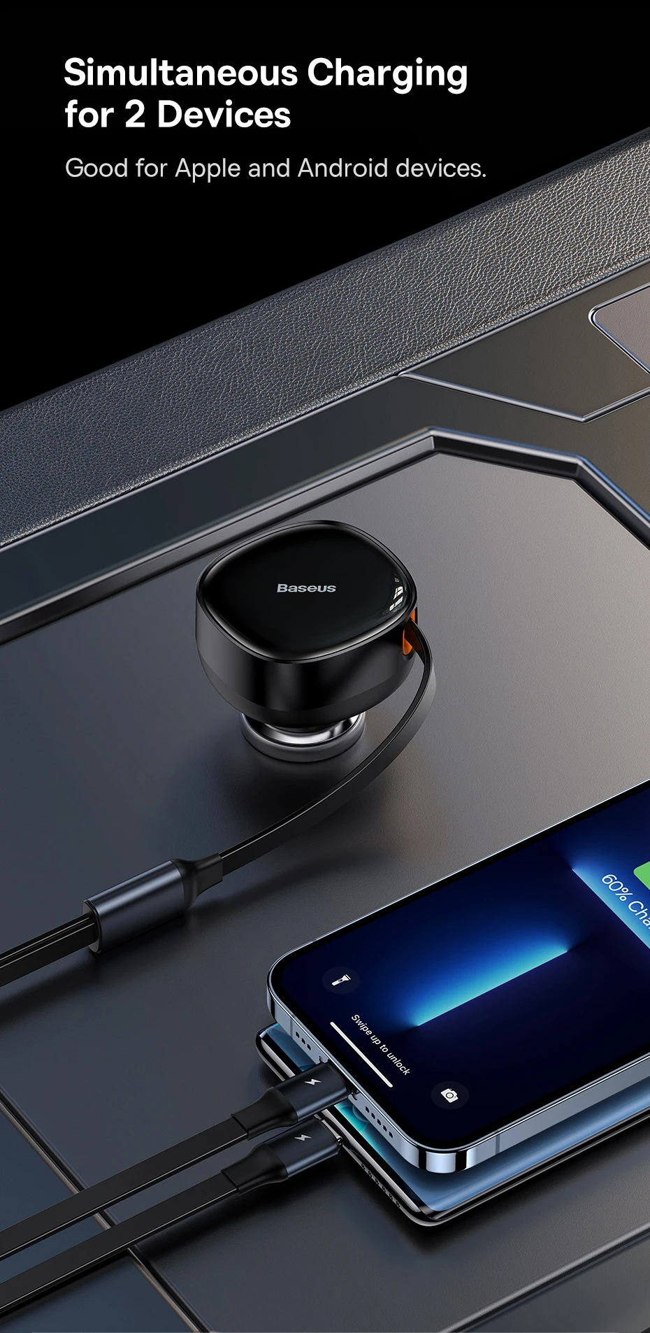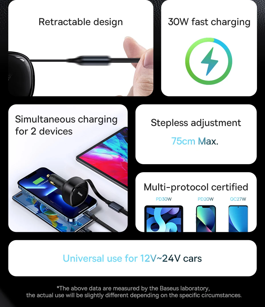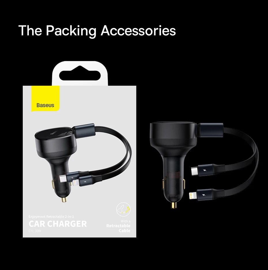 Comprar Baseus-cargador de coche USB tipo C, dispositivo de carga rápida PD, 30W, 2 en 1, Cable retráctil, para iPhone 13, 12 Pro
