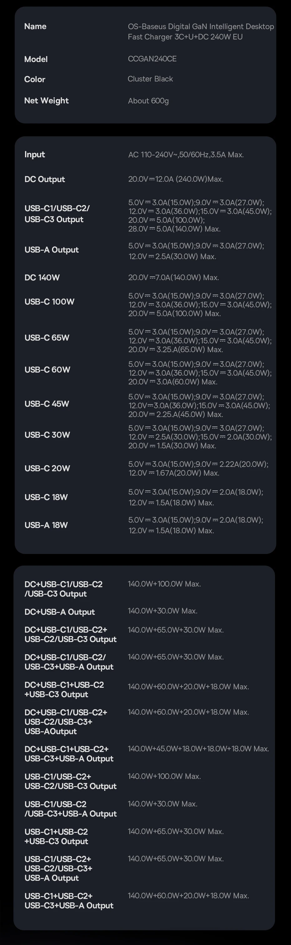 Cargador GaN rápido digital Baseus 240W 3C + U + DC