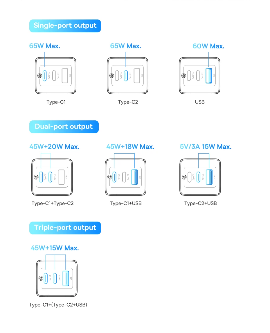Type-C1 + Type-C2 + Salida USB: 45W + 15W(60W)