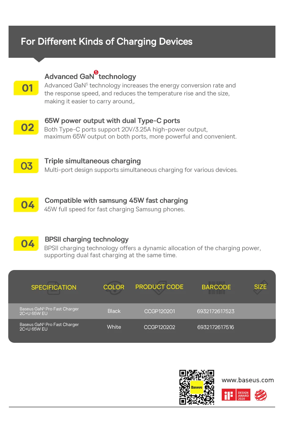 La tecnología de carga BPS II (Baseus Power Split II) mejorada realiza una carga rápida de puertos duales.
