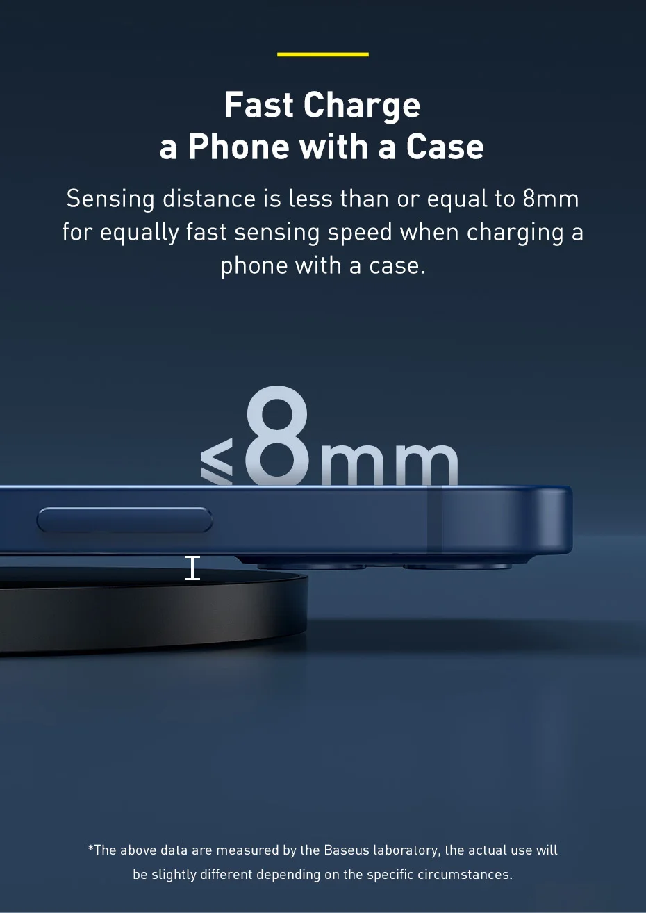 Sensing distance is less than or equal to 8mm for equally fast sensing speed when charging a phone with a case.