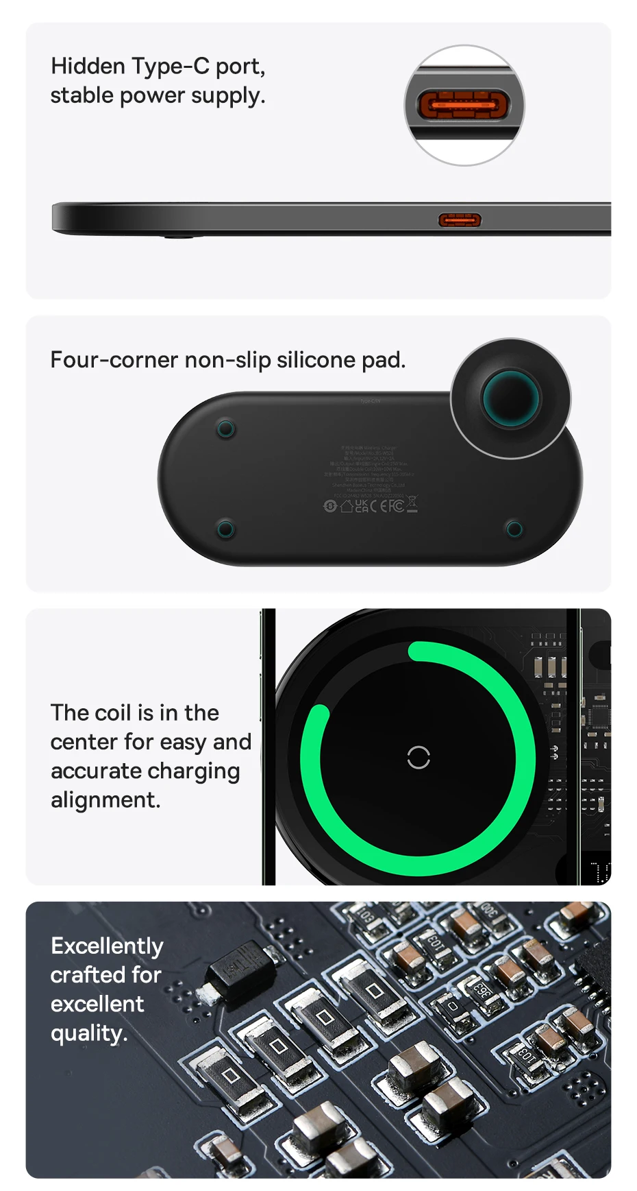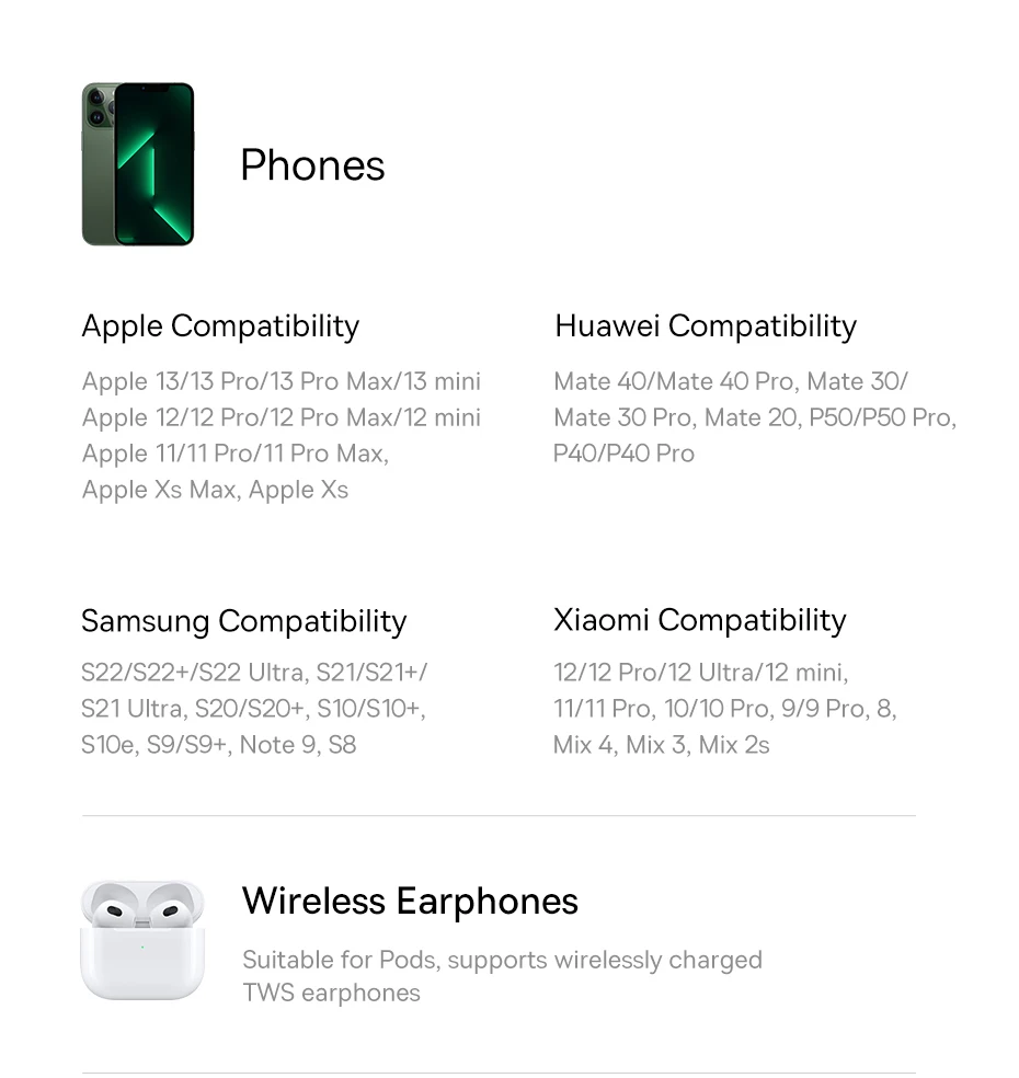 • Proporciona 7,5 W max carga para iPhone/14 / SE / 12/12/mini/12/Pro/12Pro Max 、 Pro 11/11/11 Pro Max 、 X/XS Max 、 8/8 más 、 las vainas 2/cápsulas 2 Pro