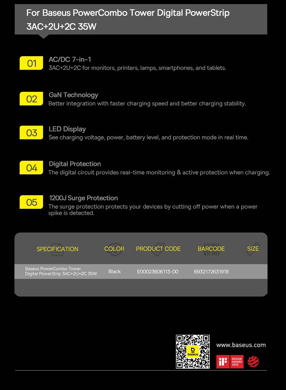Estación de carga rápida Baseus PowerCombo Tower 35W 7 en 1