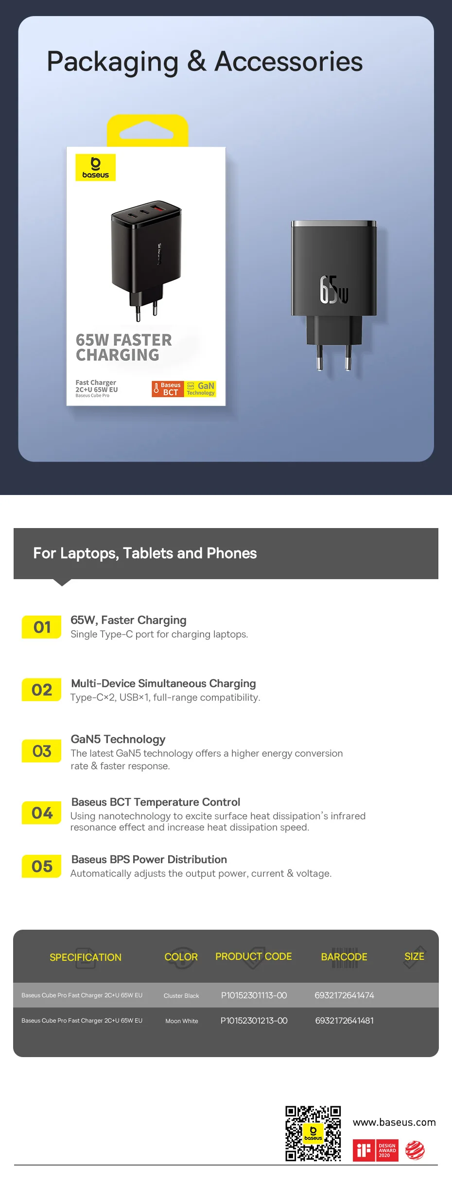 GaN5 Pro Tipo-C 1 65W Salida: 5V/3A,9V/3A,12V/3A,15V/3A,20V/3.25A 65W Máx.