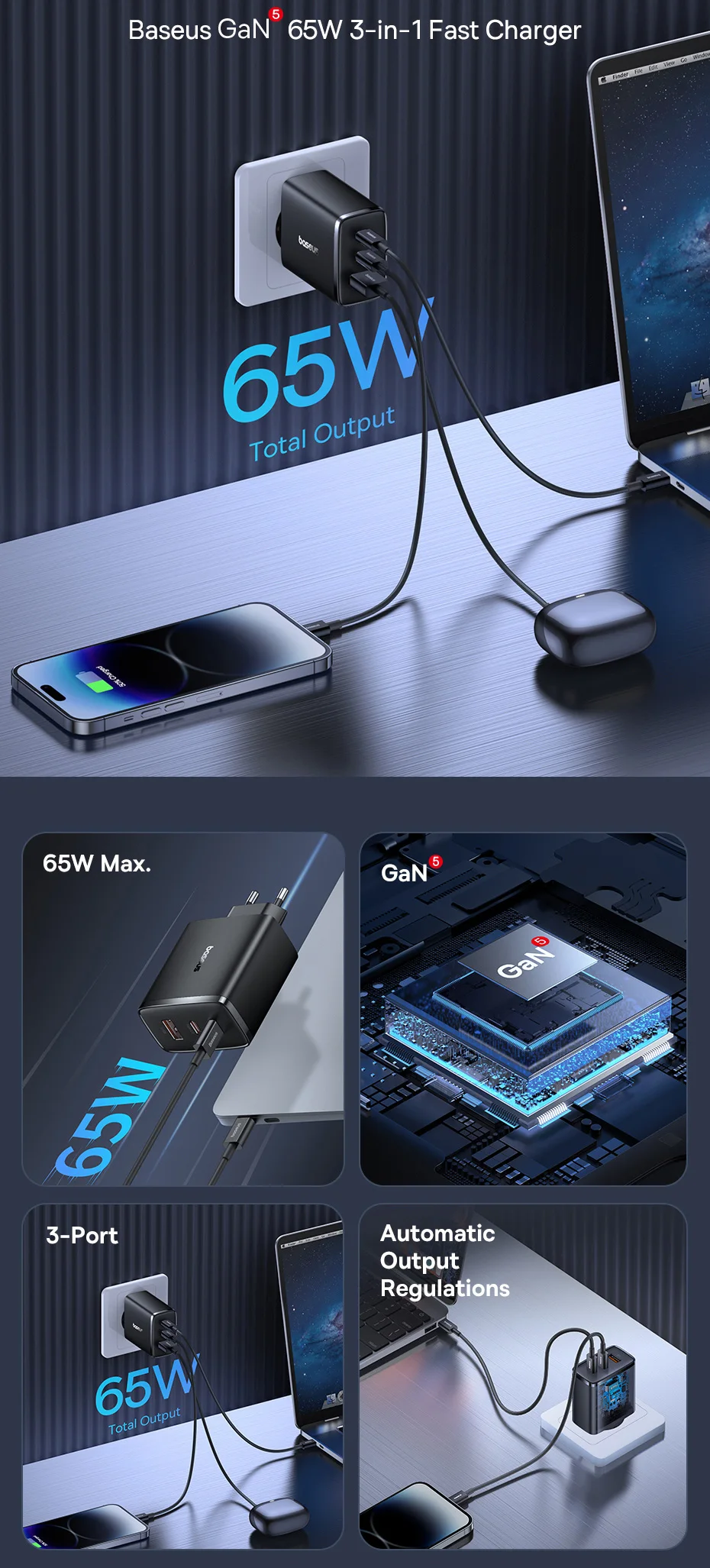Comprar Baseus-cargador USB tipo C GaN, dispositivo de carga rápida portátil, compatible con PD QC PPS, para iPhone 16, 15, 14, 13, 65W cargador