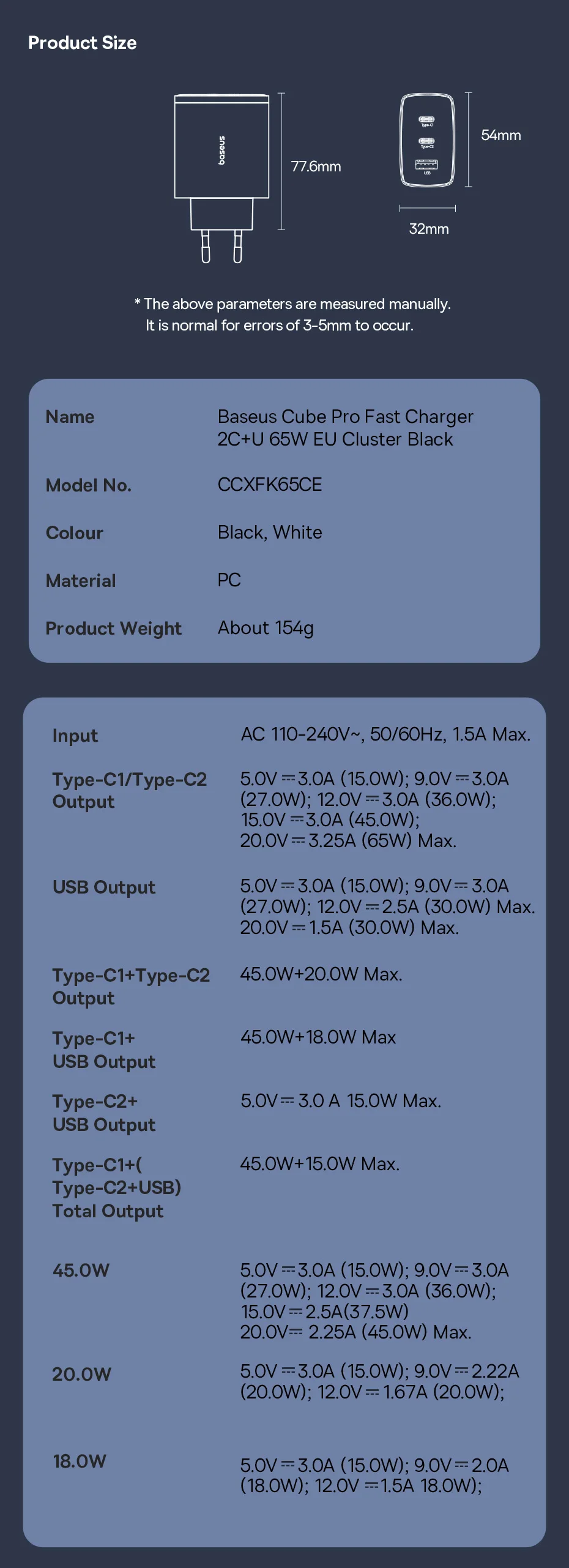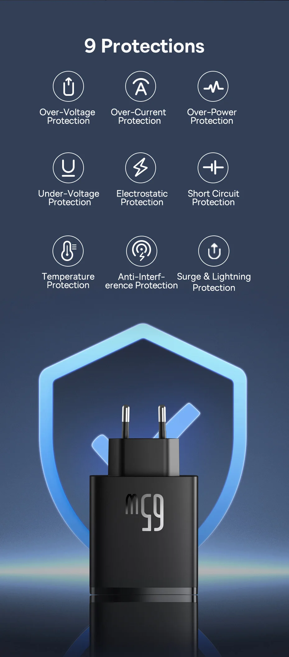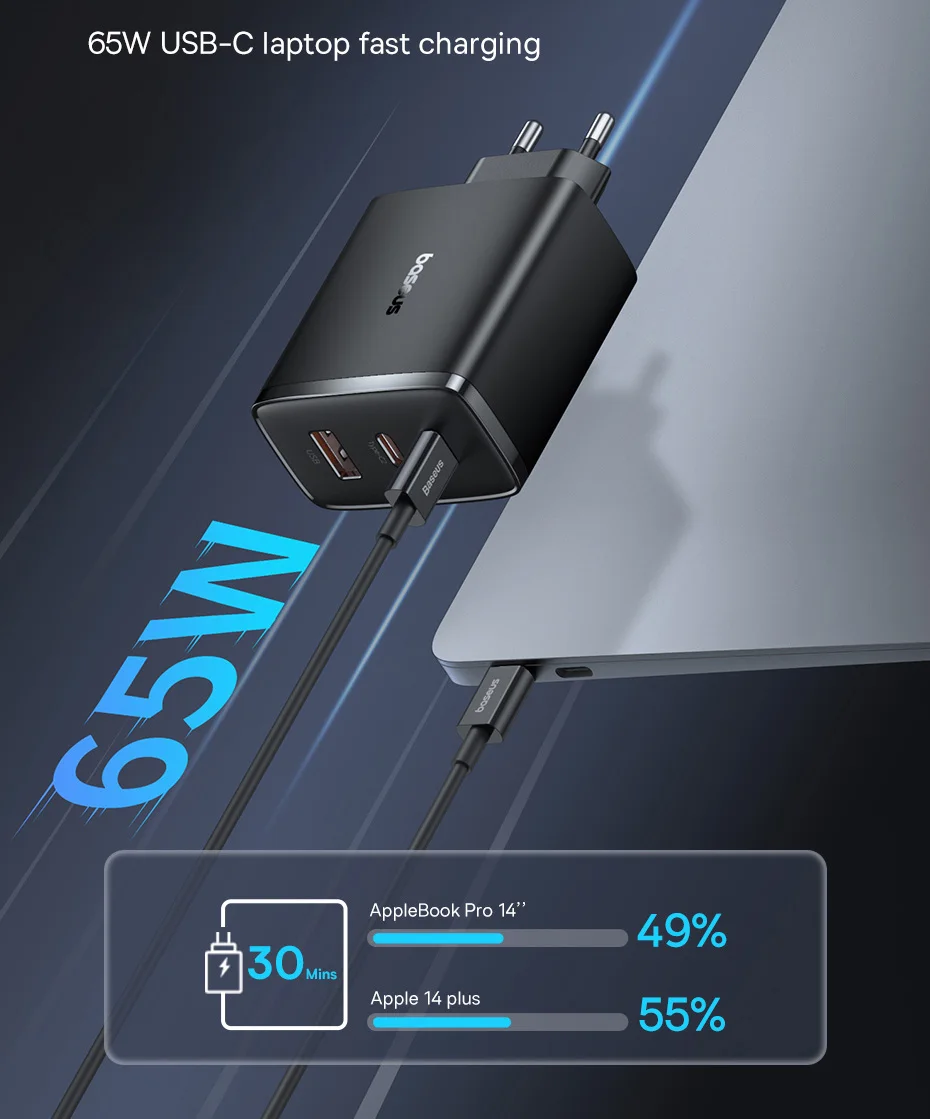 GaN5 Pro Tipo-C 2 65W Salida: 5V/3A,9V/3A,12V/3A,15V/3A,20V/3.25A 65W Máx.
