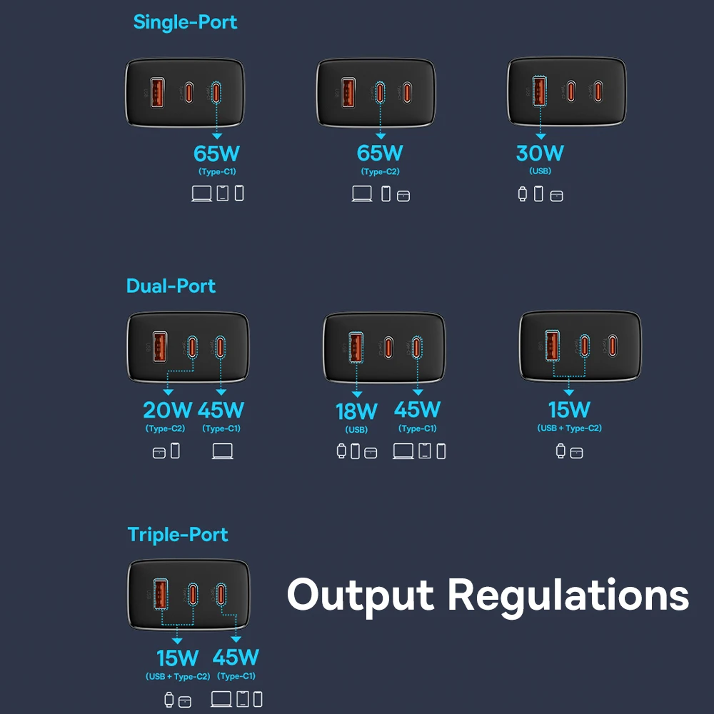Tipo-C 1 + Tipo-C 2 + Salida USB: 45W + 15W(60W)