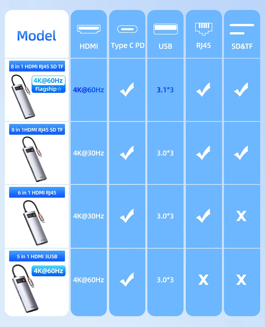 HDMI 4K @ 30Hz * 1, PD 100W Tipo C * 1, USB 3,0*3, RJ45 * 1, SD/TF * 1