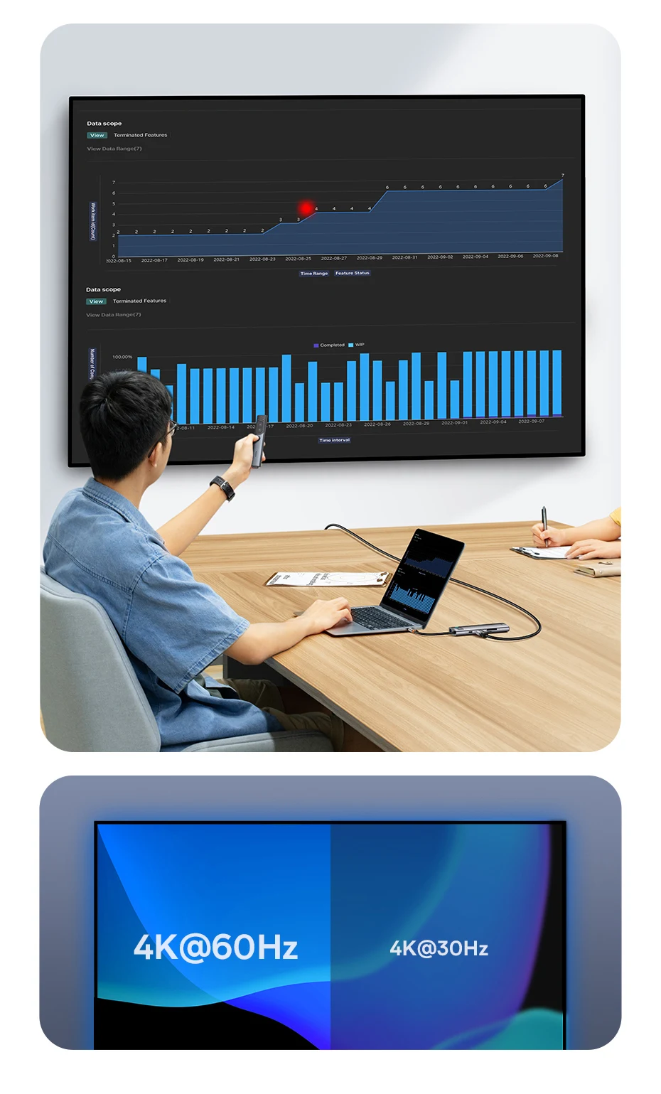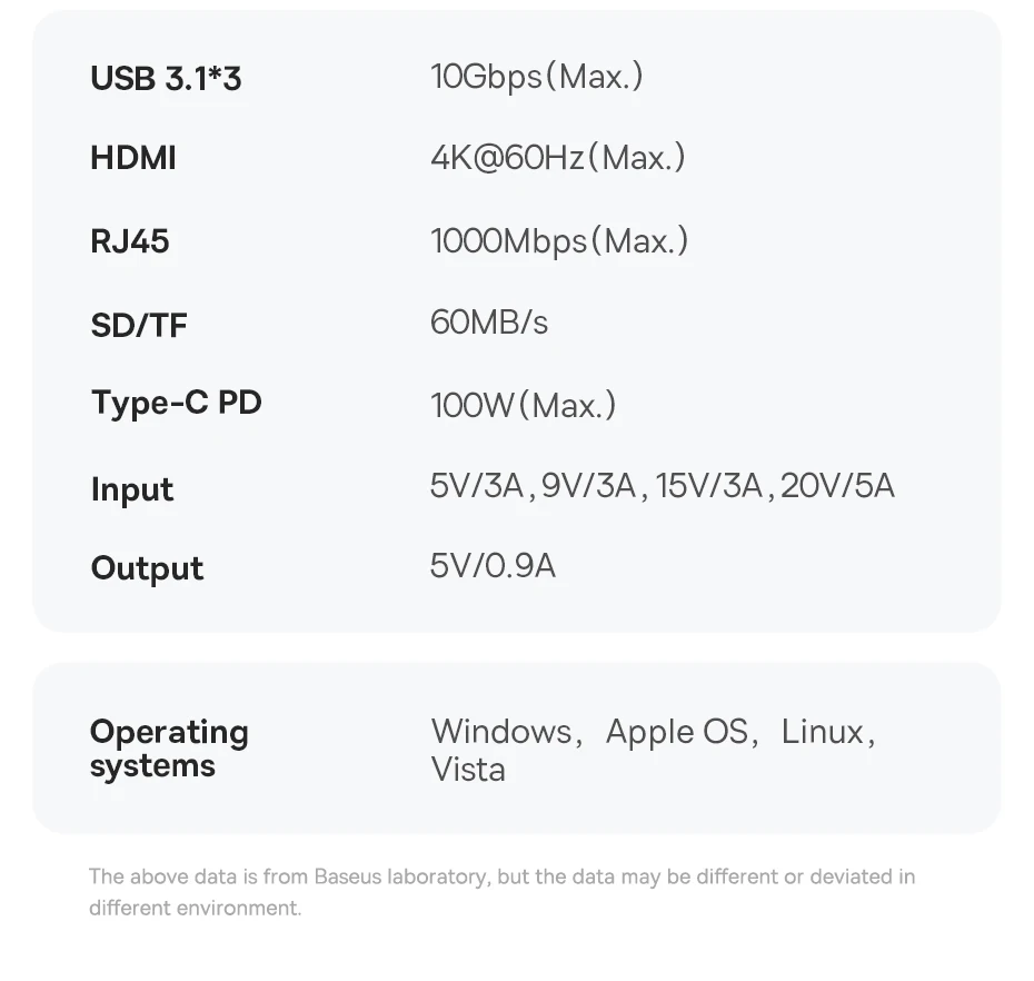 HDMI 4K @ 60Hz * 1, PD 100W Tipo C * 1, USB 3,0*3