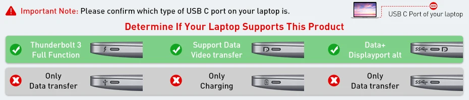 Nota:1.Asegúrate de que el puerto de tu ordenador portátil sea compatible con PD Power Delivery, DP Alt Mode y Data Transfer.De lo contrario, no se pueden utilizar algunas funciones de interfaz de la estación de acoplamiento.