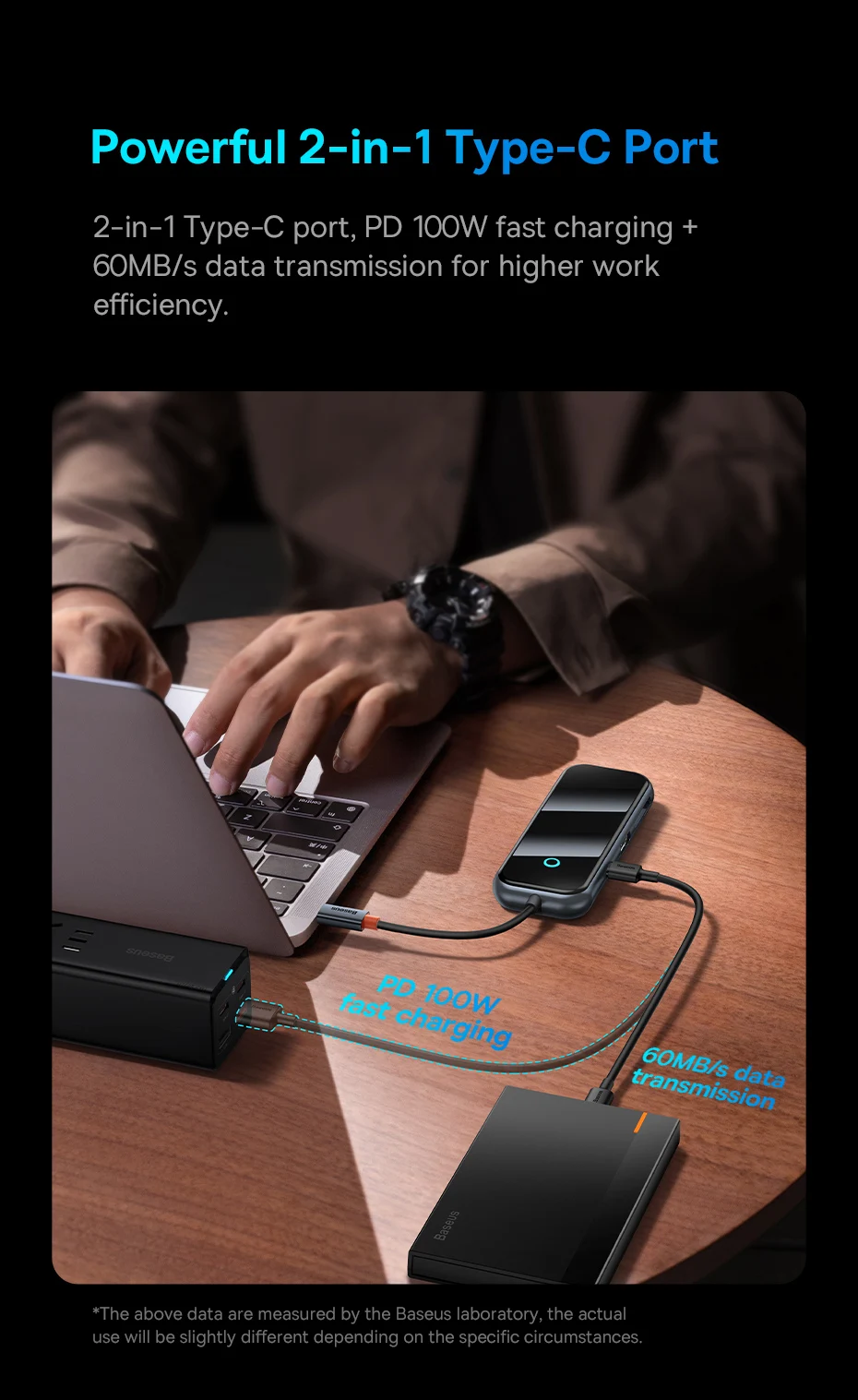 ✔Puerto tipo C 2 en 1: Carga rápida PD de 100W y transmisión de datos de 60MB