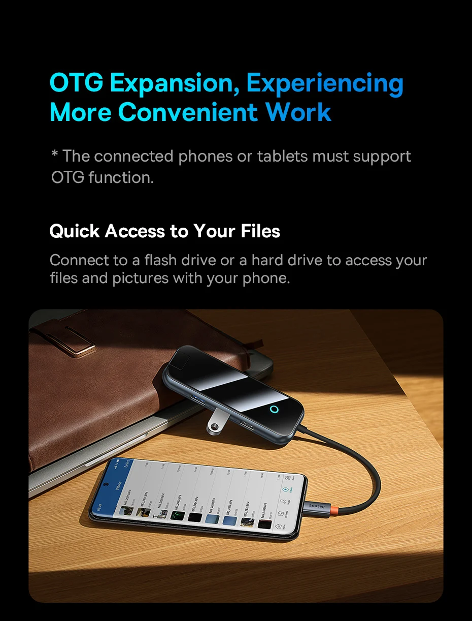 Conéctese a una unidad flash o a un disco duro para acceder a sus archivos e imágenes con su teléfono.