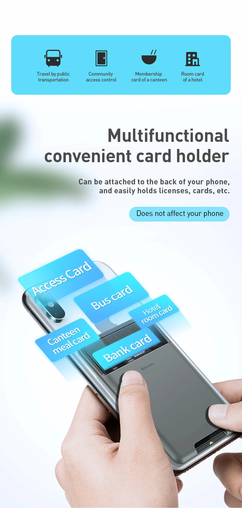 Debido al uso de pegamento duradero y fuerte, puede haber residuos de pegamento después de quitar el bolsillo para tarjetas durante mucho tiempo. Por lo tanto, recomendamos instalar la tarjeta en la carcasa o película del teléfono para evitar dejar restos de pegamento en el teléfono.
