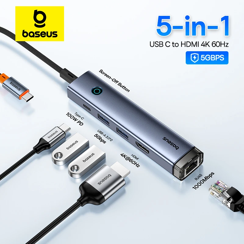 Comprar Baseus-Hub USB tipo C 3,0 a HDMI, 4K, 60Hz, Compatible con RJ45 PD, 100W, adaptador Delgado USB 3,0, para MacBook Air