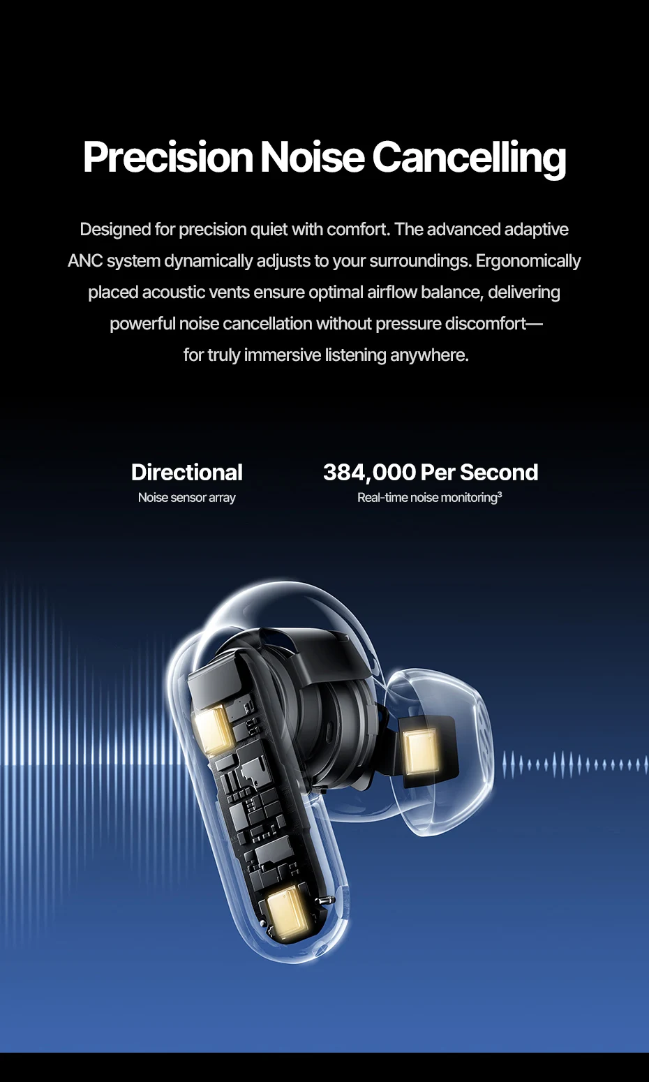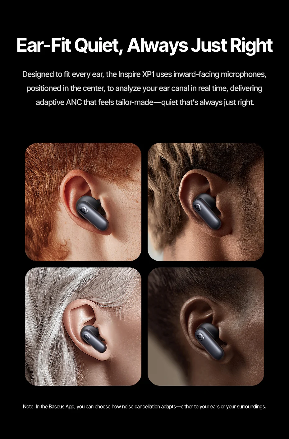 Diseñado para adaptarse a cada oído, Inspire XP1 utiliza micrófonos orientados hacia adentro colocados en el centro para analizar su canal auditivo en tiempo real, brindando ANC adaptable que se siente silencioso y a medida que siempre es perfecto.