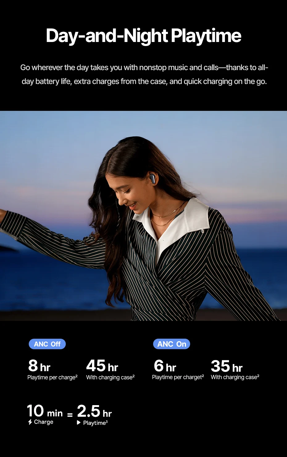 Vaya a donde quiera que el día lo lleve con música y cals sin parar: gracias a la duración de la batería durante todo el día, cargas adicionales del estuche y carga rápida mientras viaja