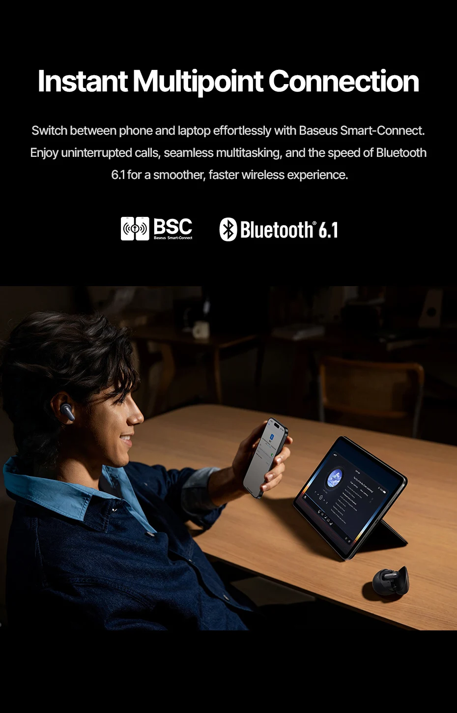 Cambie entre el teléfono y la computadora portátil sin esfuerzo con Baseus Smart-Coninect Disfrute de llamadas ininterrumpidas, multitarea fluida y la velocidad de Bluetooth 6.1 para una experiencia inalámbrica más fluida y rápida.