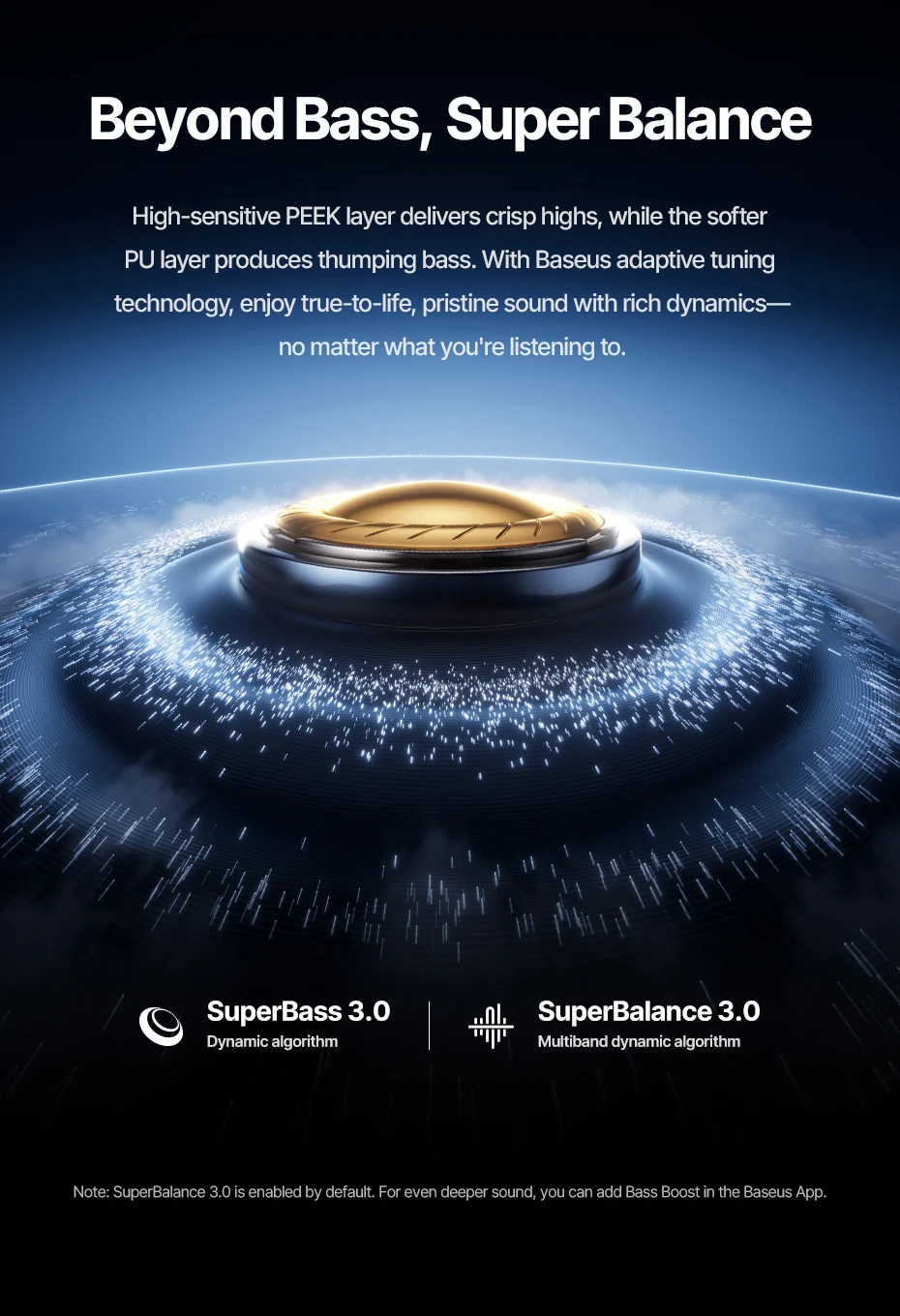 Los diafragmas PU+PEEK de doble capa ofrecen agudos nítidos y graves potentes.Combinado con SuperBass 3 de Baseus.0 y Superequilibrio 3.Con 0 tecnologías de sintonización adaptativas, estos auriculares inalámbricos con cancelación de ruido brindan un sonido dinámico y de alta intensidad que se adapta a lo que estás escuchando.