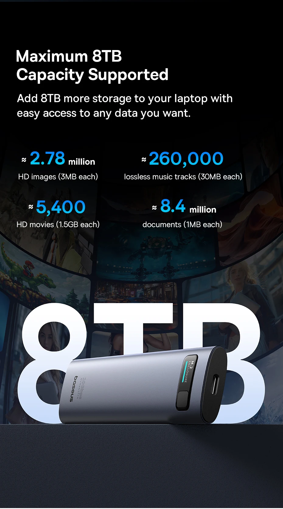 Agregue 8 TB más de almacenamiento a su computadora portátil con fácil acceso a los datos que desee.