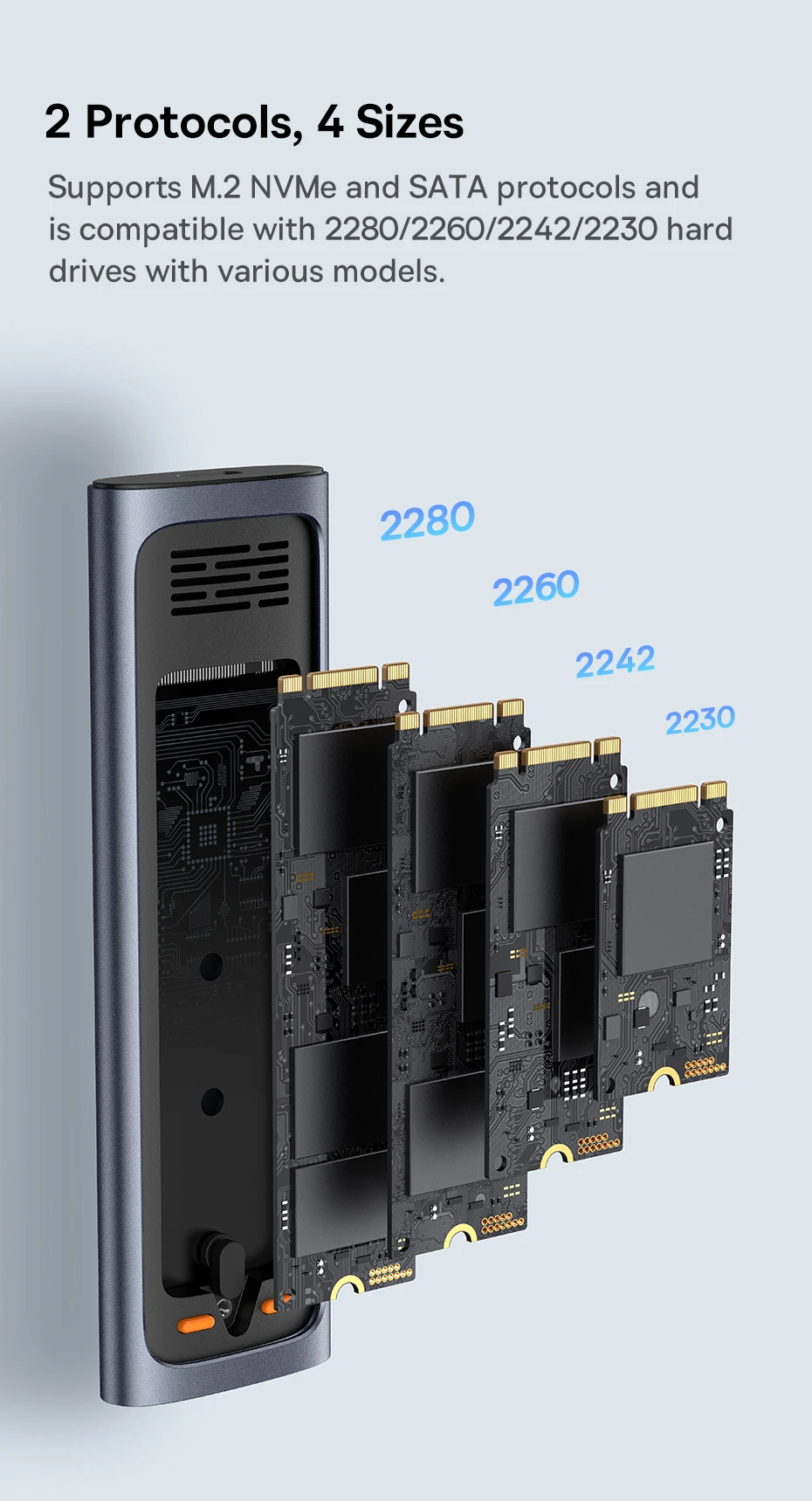 ✓Admite protocolos NVMe y SATA.