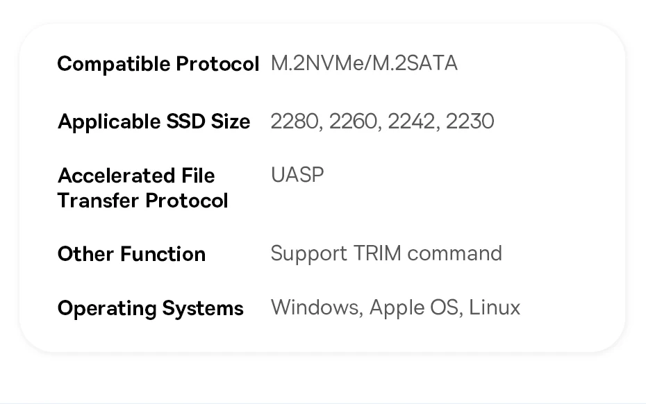 La carcasa para SSD es de muy buena calidad. Tiene un diseño totalmente metálico y es adecuado tanto para unidades SATA como NVME. Hay una almohadilla térmica de silicona para una mejor disipación del calor. Se conecta al instante y el botón de encendido/apagado es muy práctico. Mi sugerencia, que podría mejorar la experiencia general, es que tengo dudas sobre la durabilidad del tornillo de goma para fijar el SSD en su lugar. Sería mejor contar con un tornillo estándar para SSD o incluir 1 o 2 topes de goma adicionales.