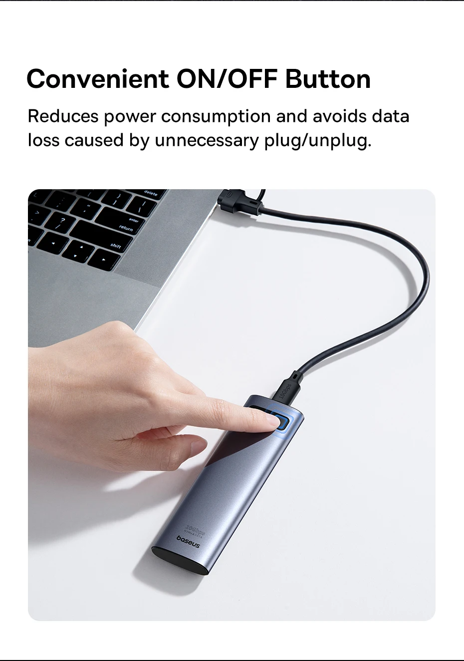 La tecnología patentada Baseus, se activa automáticamente cada vez que reinicie la computadora, retira el SSD M.2 o la carcasa para evitar la eliminación accidental de archivos y el ataque de virus.
