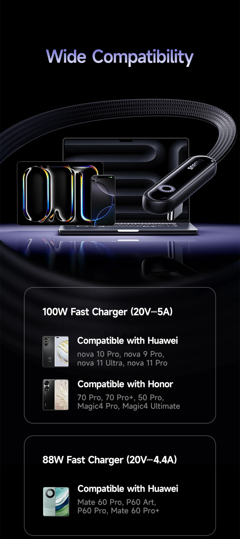 Comprar Baseus MVP3 Cable USB codificado de 100W para Huawei Honor Cable USB LED tipo C para tableta Cable de datos de carga rápida