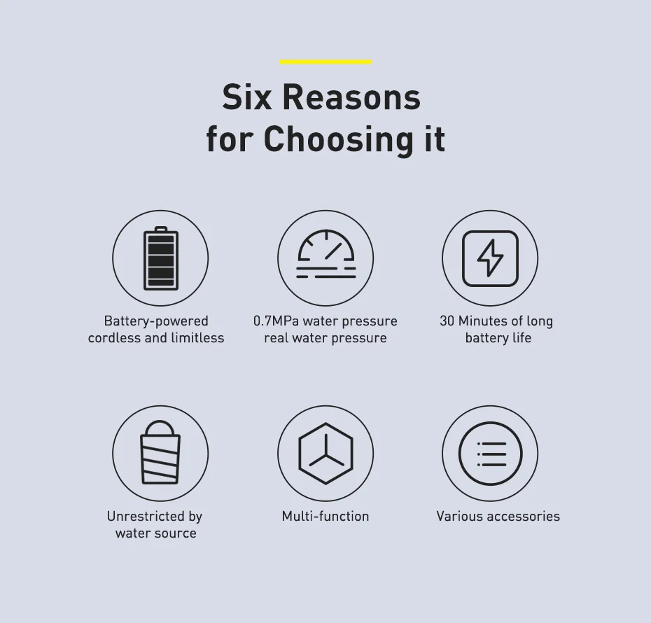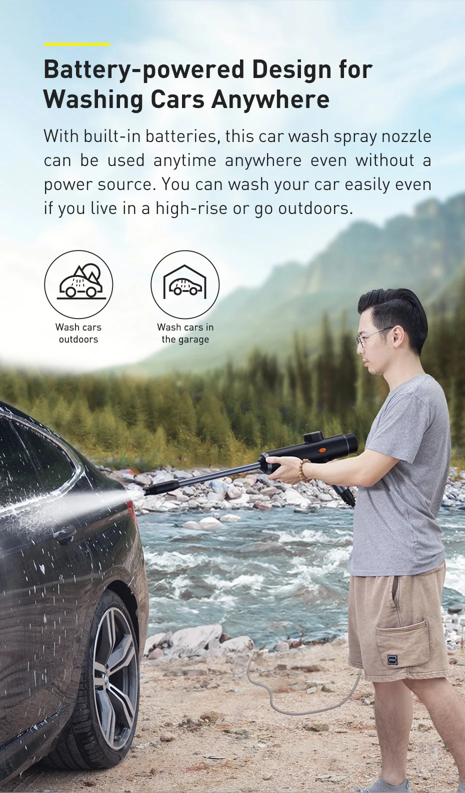 Con baterías integradas, esta boquilla de pulverización para lavado de autos se puede usar en cualquier momento en cualquier lugar, incluso sin una fuente de alimentación. Puede lavar su coche fácilmente incluso si vive en un edificio alto o sale al aire libre.