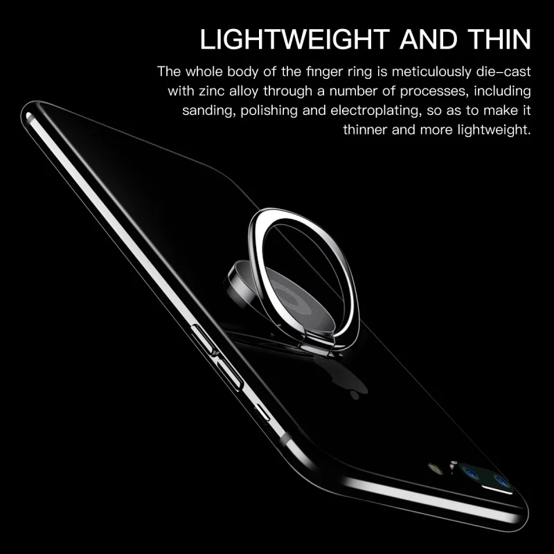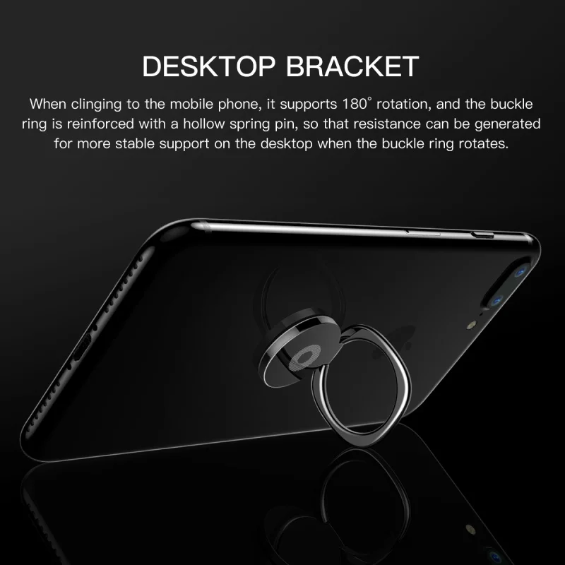 Al aferrarse al teléfono móvil, admite una rotación de 180 ° y el anillo de la hebilla está reforzado con un pasador de resorte hueco, para que se pueda generar resistencia para un soporte más estable en el escritorio cuando el anillo de la hebilla gira.