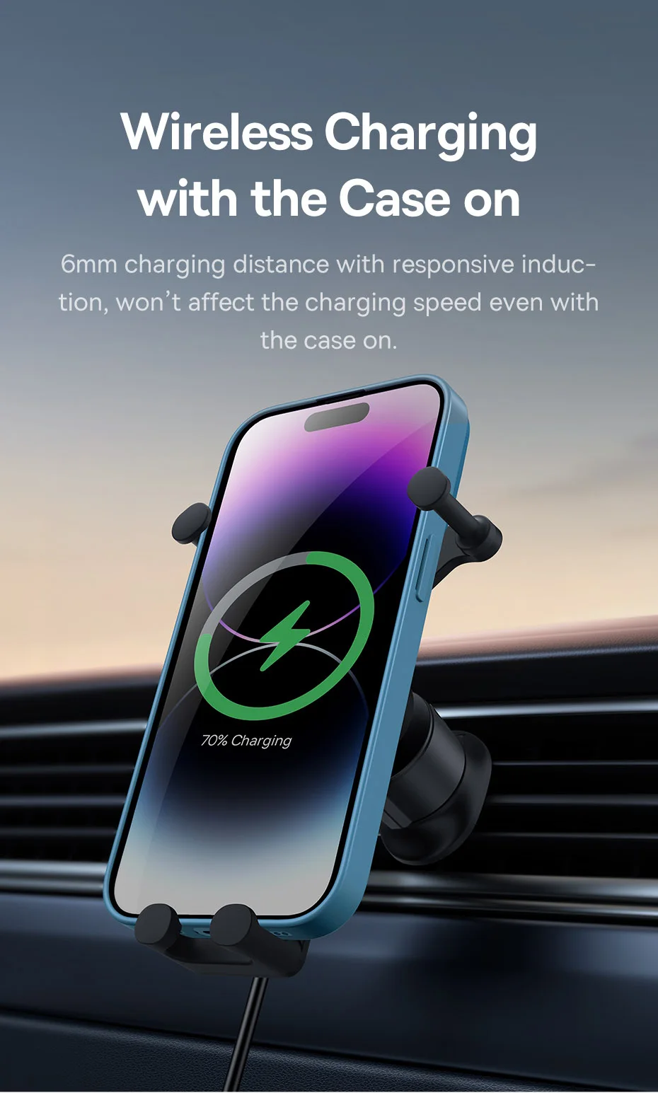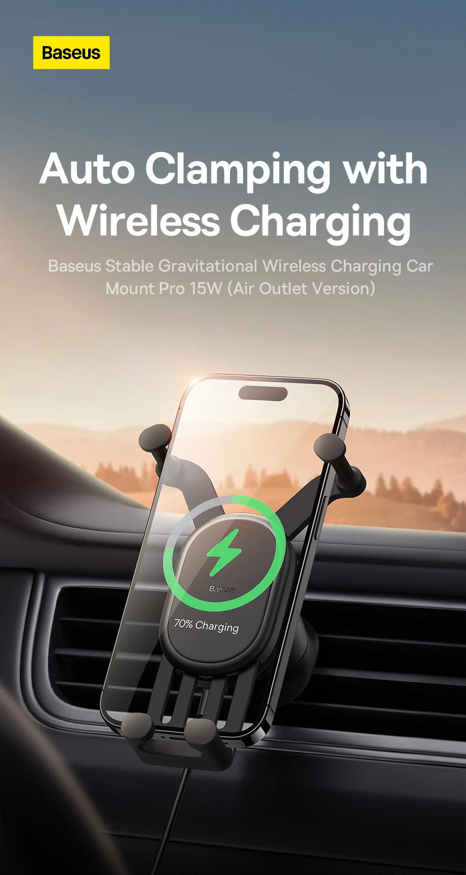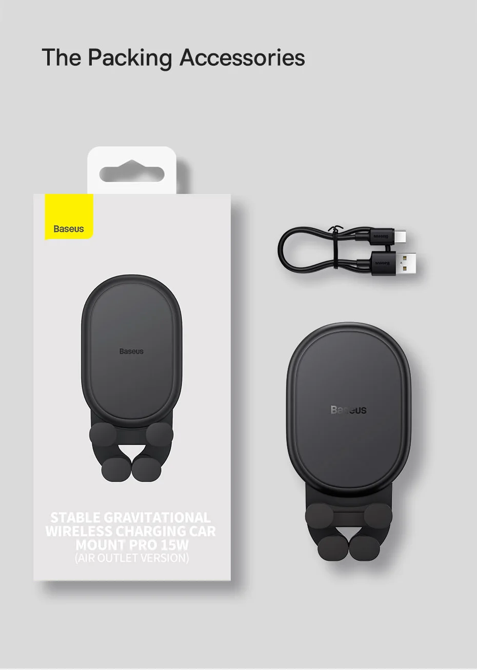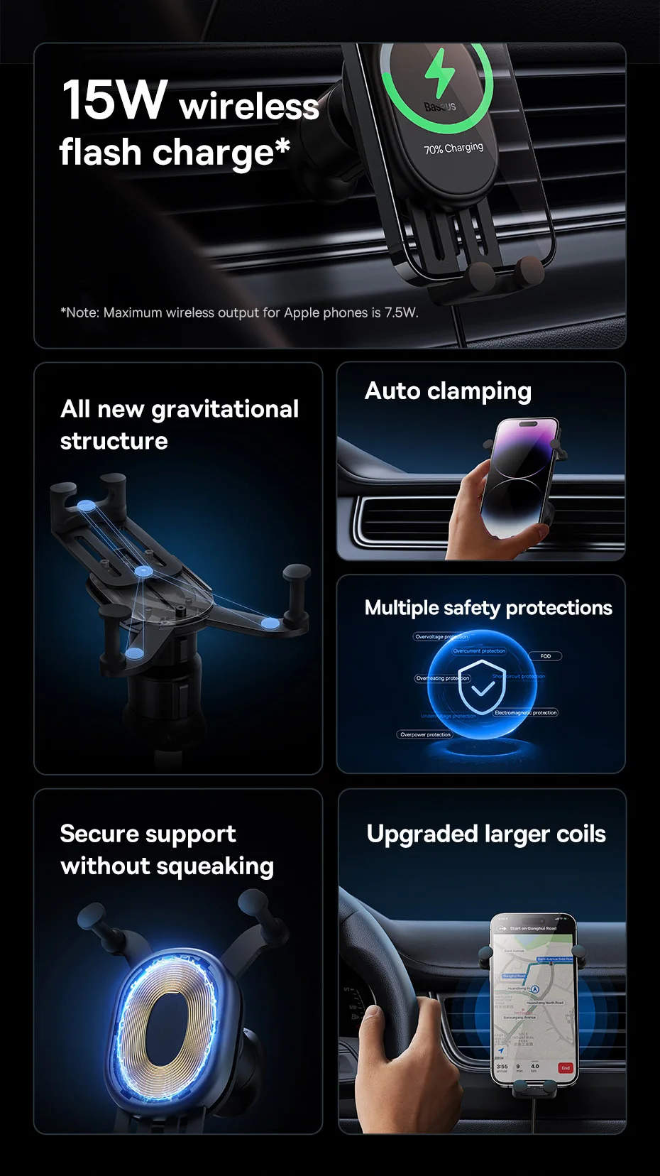 Auto Clamping with Wireless Charging Stable Gravitational Wireless Charging Car Mount Pro 15W (Air Outlet Version) 15W wireless flash charge* *Note: Maximum wireless output for Apple phones is 7.5W. Maximum 15W Wireless Output* Fully Charges in a Snap Supports 15W wireless charging,compatible with both Apple and Android. All New GravitationalStructure Firmer and More Secure Clamping Y-shaped gravitational structure, automatical-ly locks your phone in as you put it onto the mount. Applicable to 5.4-6.7 Inches Phones Stable Supportwith Auto Clamping Auto clamping with larger supporting area,stable and steady without wobbling. Grip with No Squeaking Finer structure offers a smooth and firmer grip without squeaking during driving. Larger Coil for Faster Charging Upgraded charging coil with larger inductionarea, drastically improving the charging efficiency. Advanced Chip forStable Fast Charging Smart chip with excellent temperature control,supports both Apple and Android, fully charges your phone in a snap. For Apple: 14,13,12,11,X and 8 series.... For Samsung: Galaxy S10,S10+, S9, S9+, S8, S8+...... For HUAWEI: Mate40 series, Mate30 series...... For Xiaomi: 11, 10 series, 9 series, MIX3,MIX2S...